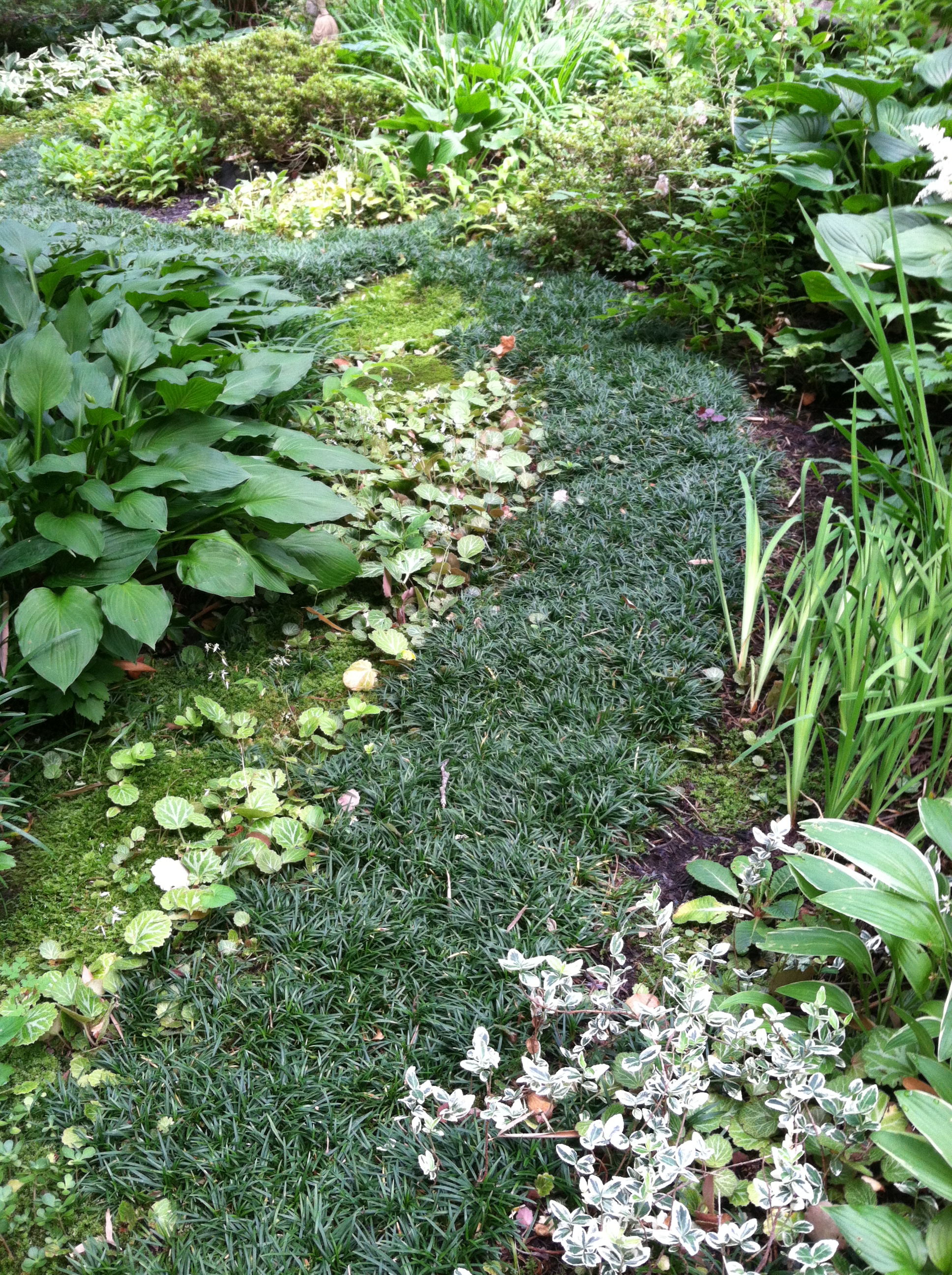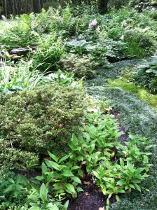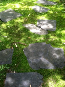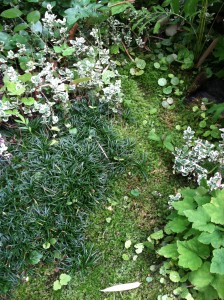 We learned that moss gardens are NOT zero-maintenance gardens, but that they require a different type of maintenance than a traditional garden. Norie taught us that “with grass you mow, with moss you blow.” Moss cannot survive under a thick layer of leaf litter, so keeping the debris cleared with a leaf blower is essential. Moss also likes to be damp. If it dries out too much, it will turn brown, so watering with sprinklers is necessary in times of drought. As with any garden, weeding is also necessary. Norie told us that the beauty of moss gardens is that you can selectively leave “volunteers” that are growing up through the moss. If it were a lawn, some of her favorite volunteer perennials such a Aquilegia (columbine) and ferns would have been mown down. In her garden, they can live in happy harmony with the moss.