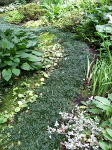 Peaceful mossy path bordered by shade perennials and accented by garden ornaments such as this sundial.