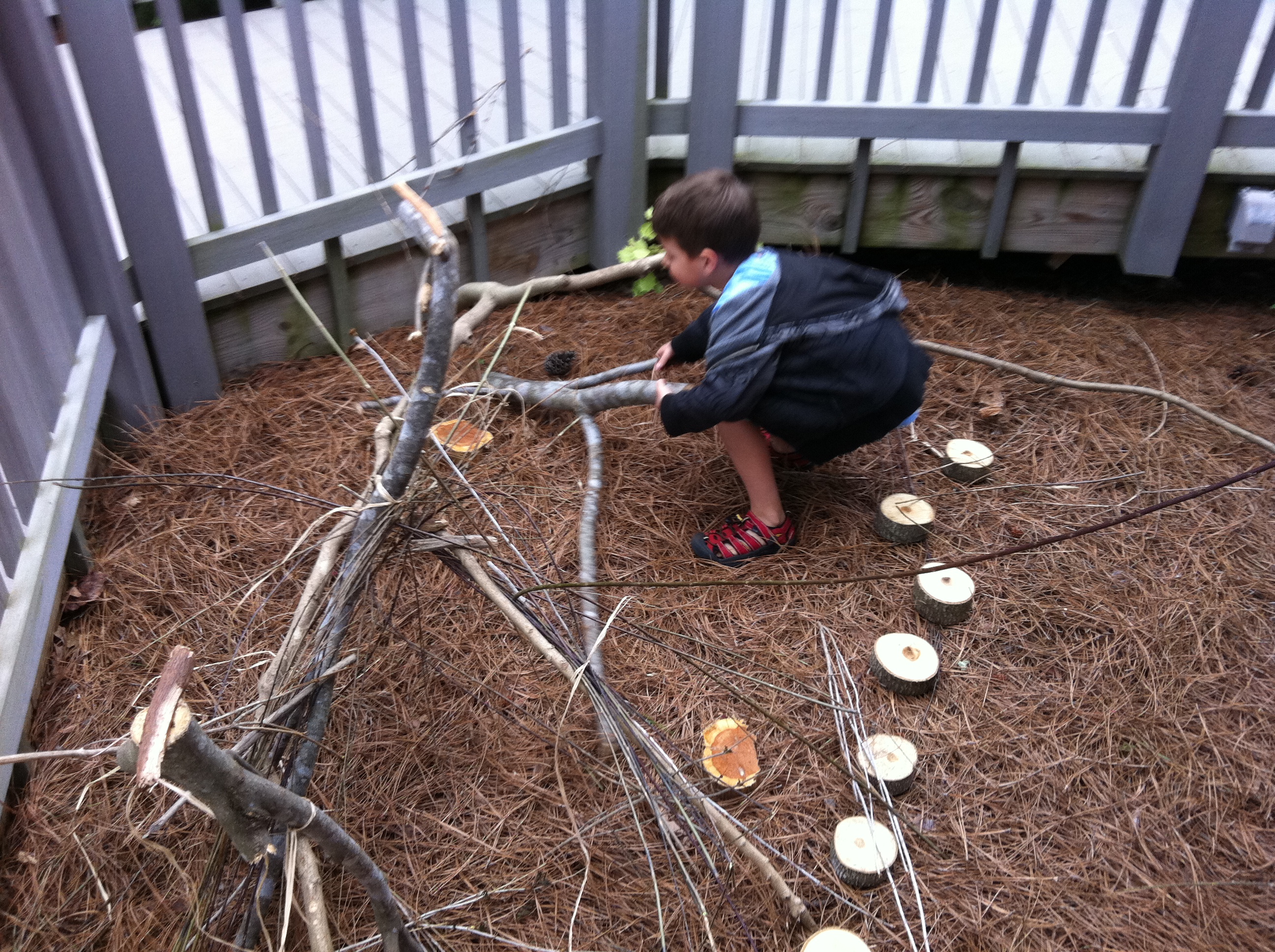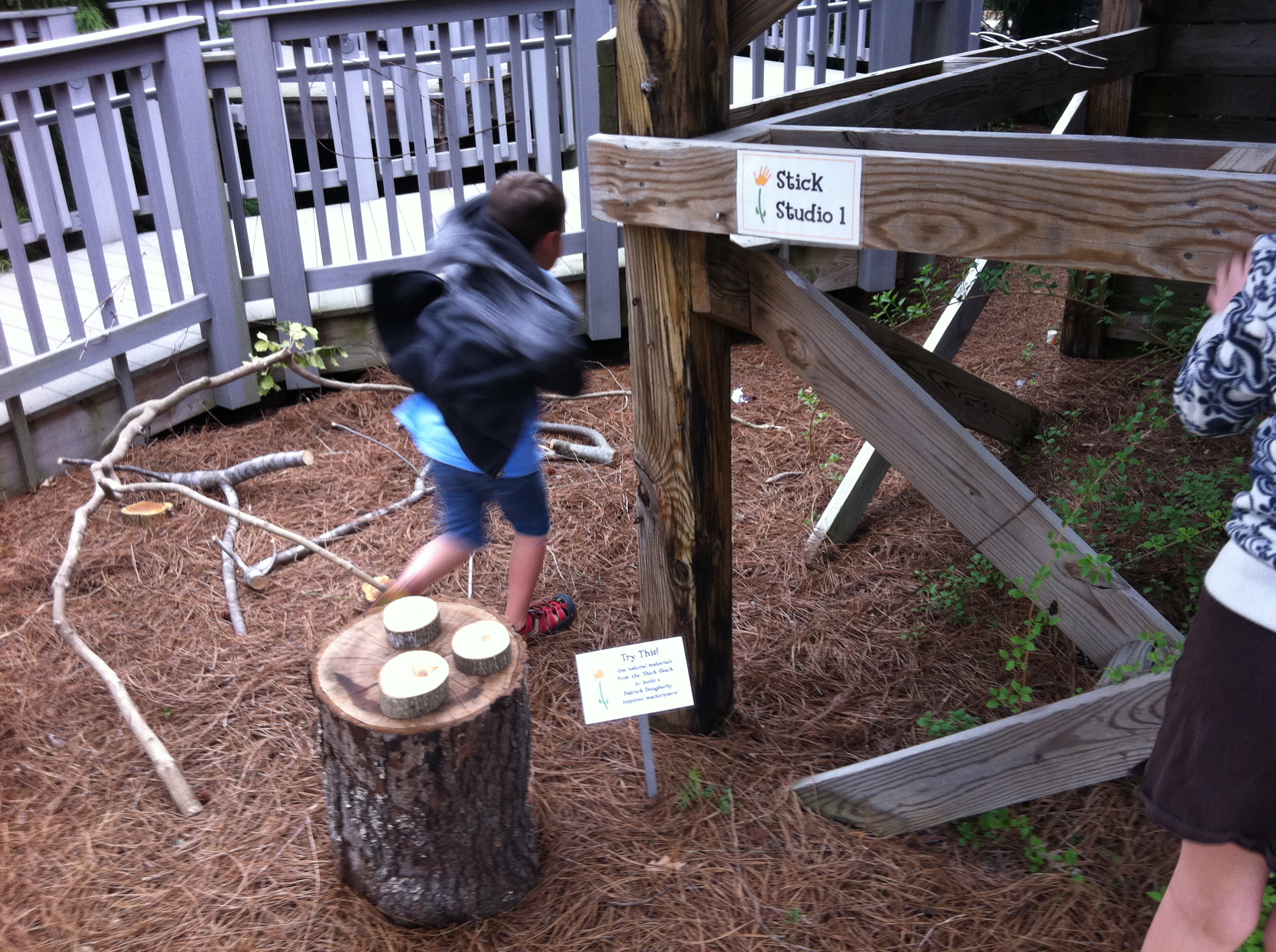 The past few times I’ve come to the Garden with my family, my children have been scurrying off in a corner somewhere under the decking for the Children’s Garden Tree House. Yes, they still want to climb the 100-year-old mulberry tree, and yes they want to visit with the Children’s Garden staff who’ve become like friends to them, but there is something enchanting about climbing into a cool cubby that is hidden away from the main action in the Garden. There’s a new area of the Children’s Garden called StickWork Studio full of shady nooks for crafting and creating. These nooks are filled with cuttings & sticks from various places in the Garden and are meant to be worked into creations — sculptures and anything else that a kid can dream. Sliced logs are stepping stones or stackable sculpting blocks. Re-purposed gala decorations are frames for art & weavings.