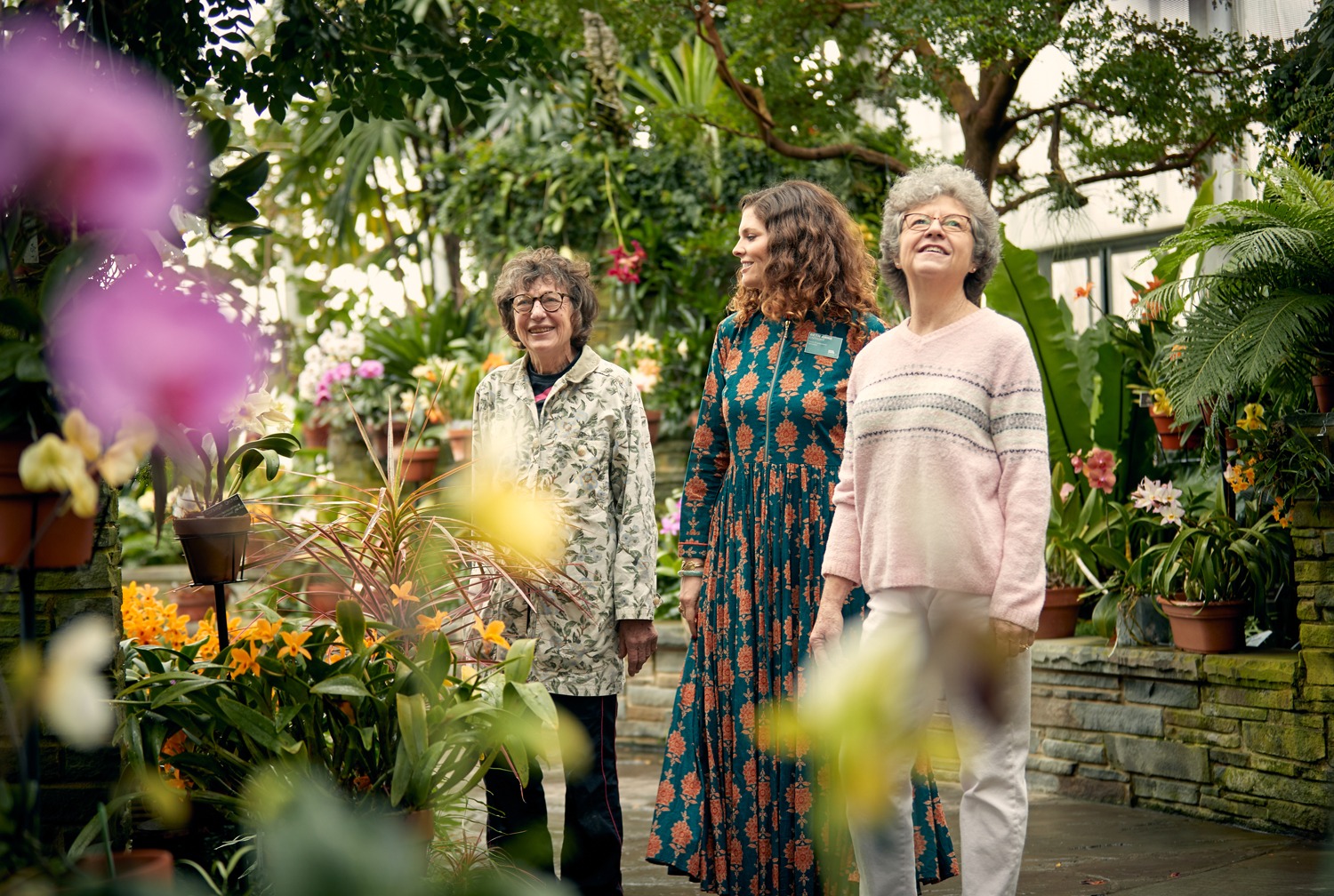 Beth Anne Booth, Guest Engagement Specialist, with volunteers Sherry Giese (left) and Helen Blencowe (right) in the Conservatory. Image by Graham Copeland.