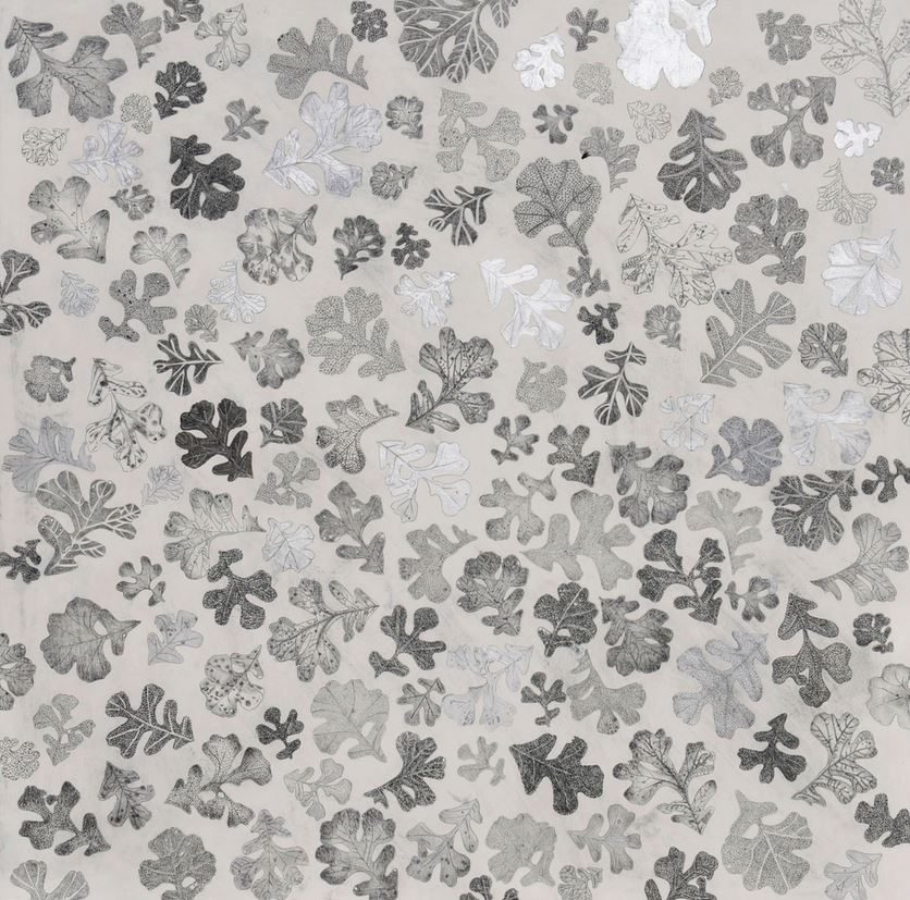 EL: I collect actual specimens from nature. The drawing, Aspen, was done from a leaf I found at Zion National Park in Utah one summer. For this series, I then took a photo copy of the leaf and enlarged that first copy to a 30″ x 30″ size. When I work, I feel like I’m doing a portrait of this one specific leaf and I want to make sure I get all the tiny veins and insect holes and mold spots. The natural world is infinite in detail and I want to record that specificity. I can’t make up stuff this good. The drawings are done on claybord panels. I first apply a wash of acrylic paint and use a very soft graphite pencil to do the drawing.