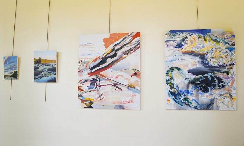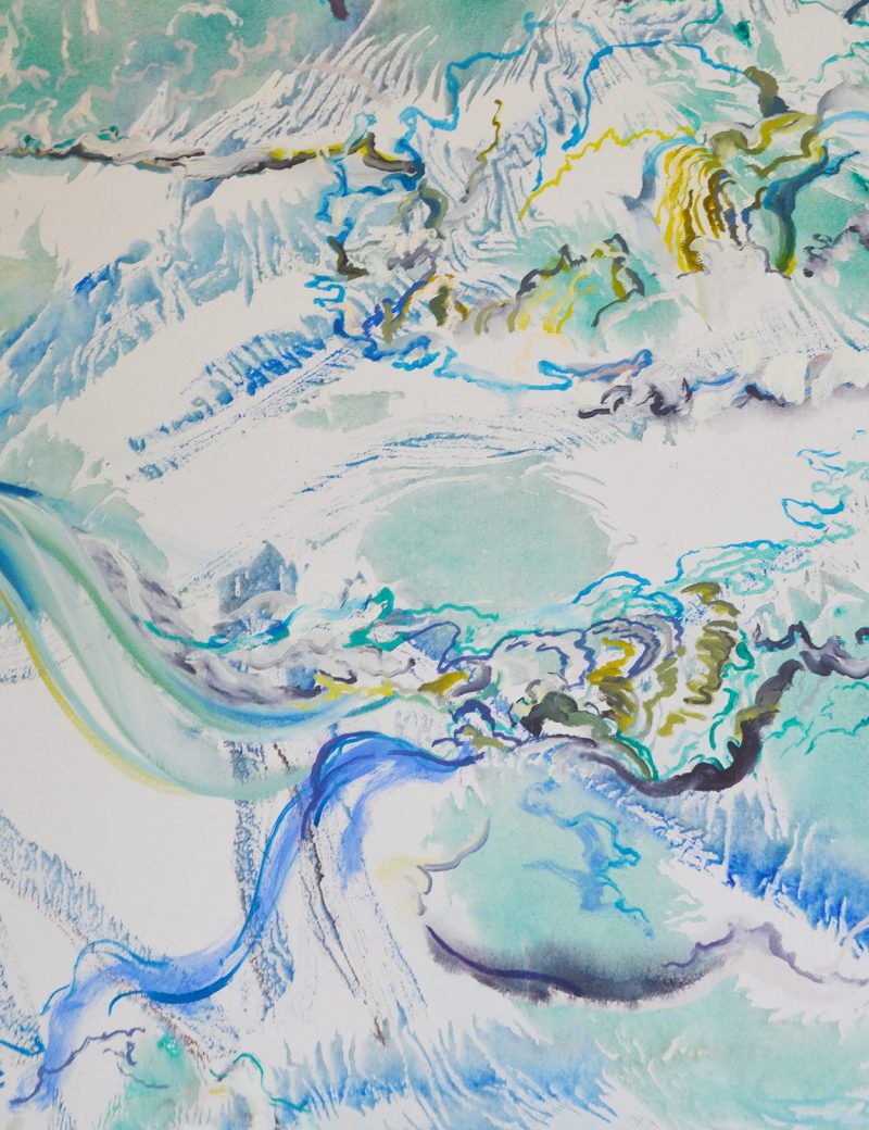 Q: At the same time, in your paintings, the push and pull of river is mimicked by gesture and color; the fluidity is turbulent and calm, violent and serene. The color and light is energetic, yet harmonizing. It seems like the flux and power of the river and landscape is important to this work. Can you talk about these contrasts? How do they connect to your idea of the sublime?