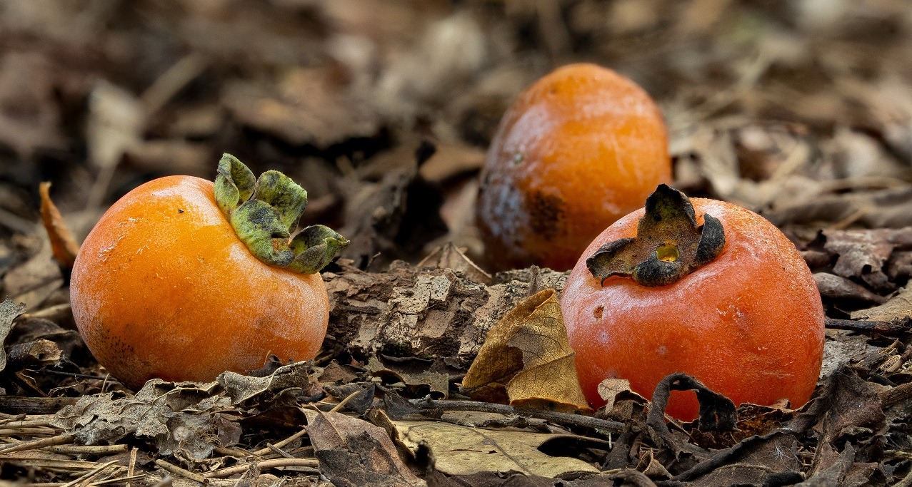 Fallen fruit of common persimmon (Diospyros virginiana). Fruit is eaten by many species of wildlife and by people. Native to the southeastern United States.