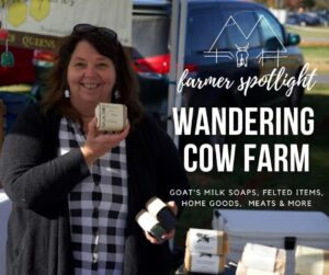 Mary Murphy and her husband of 43 years moved to Richmond 13 years ago from Connecticut to start their family farm, Wandering Cow Farm. While living in Connecticut, Mary’s family always had a small farm producing enough vegetables and eggs for the family to eat. As their 7 children grew up and became members of 4H, the family began to acquire dairy goats, sheep, and cows that liked to wander. That is how Wandering Cow Farm was born and earned its name. While her kids were occupied with 4-H, Mary was busy learning to make cheese, soap and other natural skin care products, and learning how to felt with the wool produced on the farm. This new knowledge of how to create products with herbs and other botanicals fueled a full business. Mary and her family began selling their products, which has led to a love for helping as many people as they can with not only the products but also by sharing the knowledge they’ve gained over the years. The family and farm’s motto is: “Taking the best nature has to offer and producing the best possible products for you.” Slowly, 6 of their 7 children have moved to the Richmond area and offer a helping hand on the farm. When not busy with her business, Mary is a doting grandmother to her 10 grandchildren.
