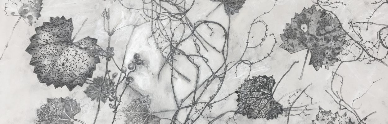 A graphite drawing of Vine and Vitis leaves and vines on a textired white background.