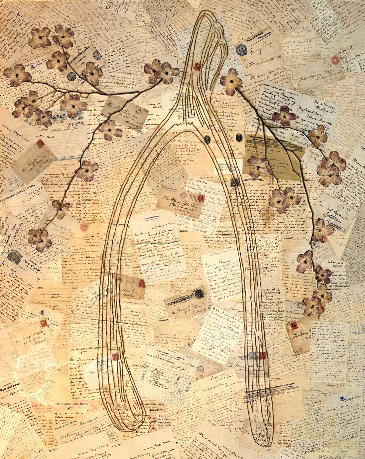 “Love Letters” is a collection of botanical artworks made from a satchel of old letters from McCauley’s father after he passed away. The letters are correspondence between her great aunt & uncle, dating from 1898 to 1928. The letters, filled with elaborate, beautiful handwriting are all about LOVE!