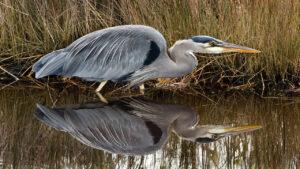Great Blue Heron stalking for minnowsin canal along the main roa