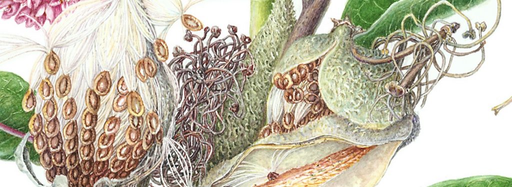 With the splash of fall colors waning in woods and meadows, rather subdued seed pods catch the eyes of botanical artists. The seeds and pods are a perfect subject to study form, value and fine brush techniques in a monochromatic color scheme. In this workshop, students will use milkweed seed pods, which offer various learning elements: how to deal with the fine white hair/thread of the downy tufts, how to balance the complicated structural form of the seeds in an orderly composition, how to use a value system to maximize the three-dimensionality of the exploding seeds, and how to create fuzzy textures. This is an online class via Zoom.
