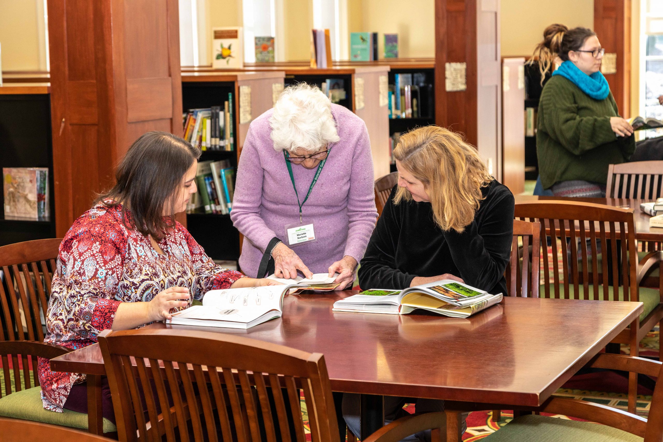 Three women huddle around their books at a table in the Library; a fourth woman stands behind them.