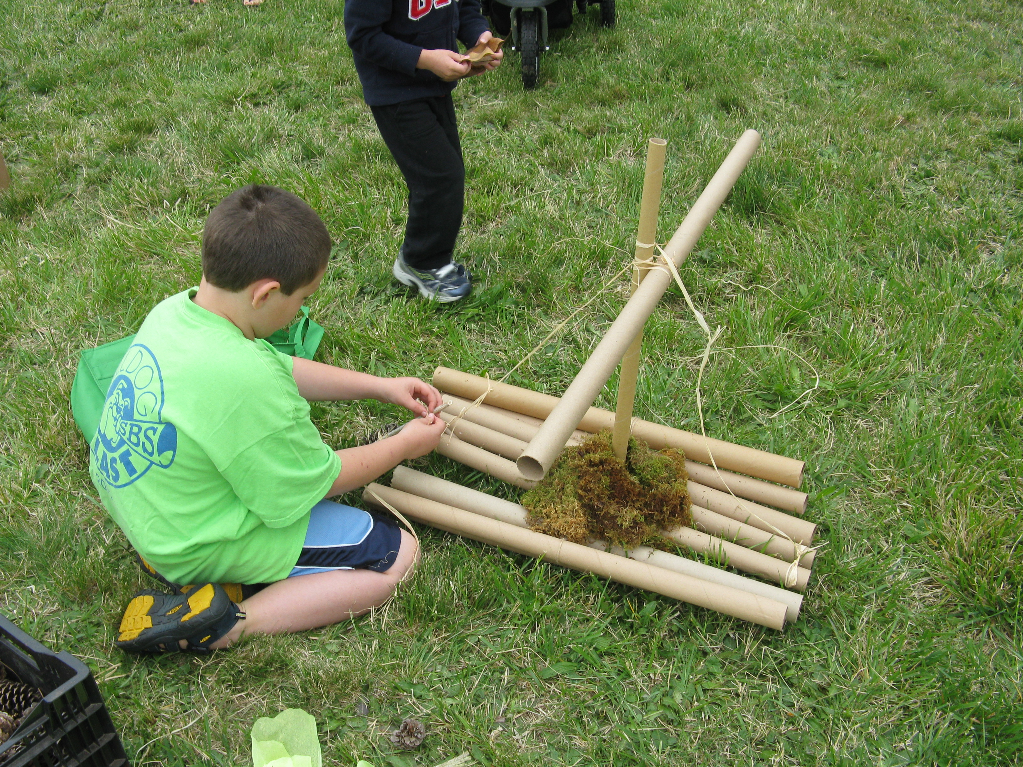 Intrepid Children’s Garden volunteers, Barb and Buz Sawyer, their grandson, Andrew Cobus, and I spent the afternoon fielding the most popular question of the day, “What do we DO here?” The answer: “Use your imagination and create!” And boy, did they create! Rafts, hats, tepees, fairy houses, wands, castles (one with a working draw bridge!), animal habitats, and more.