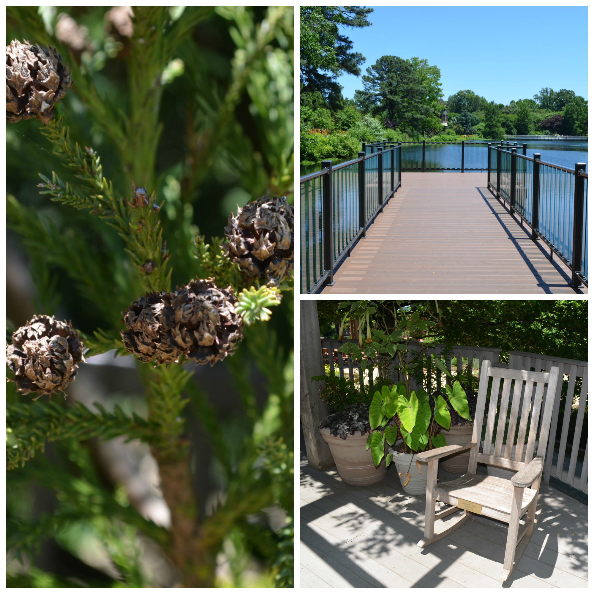 Left: You can find this Japanese cedar (Cryptomeria japonica) at the Children’s Garden Leafy Overlook. Top Right: The Chance Dock, located off of the Lucy Payne Minor Garden. Bottom Right: Find a collection of rocking chairs at the Leafy Overlook on the way up to the CWDKids Tree House.