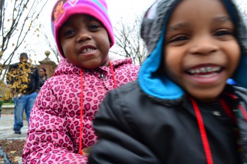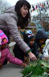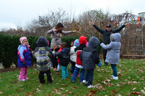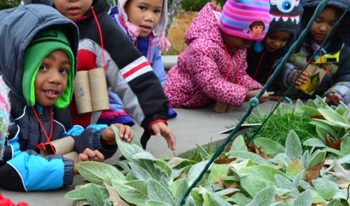 I had an amazing time in the Garden last month with these fine young folks from Richmond Public Schools’ Chimborazo Elementary School‘s 3-year-old Head Start class. We read a story about animals and then looked for birds and other creatures in the Garden with our “binoculars.” As we explored the garden we decorated our binoculars with leaves and other treasures. The Garden provides this educational outdoor experience for these students through our Young Buds program. We had a great time looking at all the plants, and the children especially liked “petting” the lamb’s ear (Stachys byzantina). We even flew through the Garden like birds!