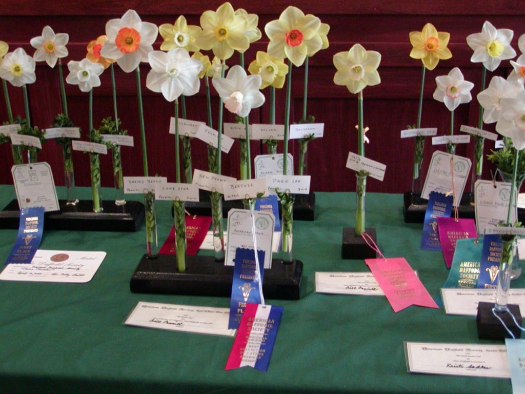 When I met the leadership of the Virginia Daffodil Society, the presenters of the flower show I just described, I was amazed at the detail involved in the daffodil show. Categories were meticulously marked out on long risers, according to a multi-page booklet. Exhibitors brought in hundreds of entries freshly picked from their gardens to stage for judging in special props. Judges trained in the minutiae of perfect form and color examined hundreds of entries. Mind you, this was before the ability to instantly look up blooms in online catalogs, and daffodils alone have 2,500 known cultivars. That’s “known.” There could be more! Some blooms were unidentifiable and made their way out of competition to a “what is it?” table.