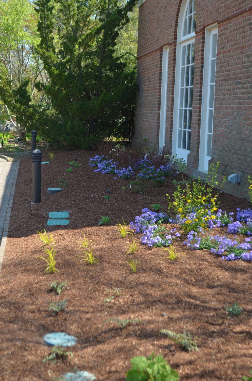 The plant bed, located outside of the Garden Cafe, near the path towards the Asian Valley Garden, previously contained sun-loving plants. The bed is located next to a north facing wall, which means those plants get fewer hours of direct sunlight. As the surrounding trees have matured and more shade has accumulated, these plants started to struggle. Horticulturist Dean Deitrich designed a new plan for the bed that focuses on part-sun/part-shade plants. The Robins Visitor Center plant bed now contains 14 different types of plants that will be able to thrive in moderate shade. The plants filling the bed now will reach their full maturity in about three years.