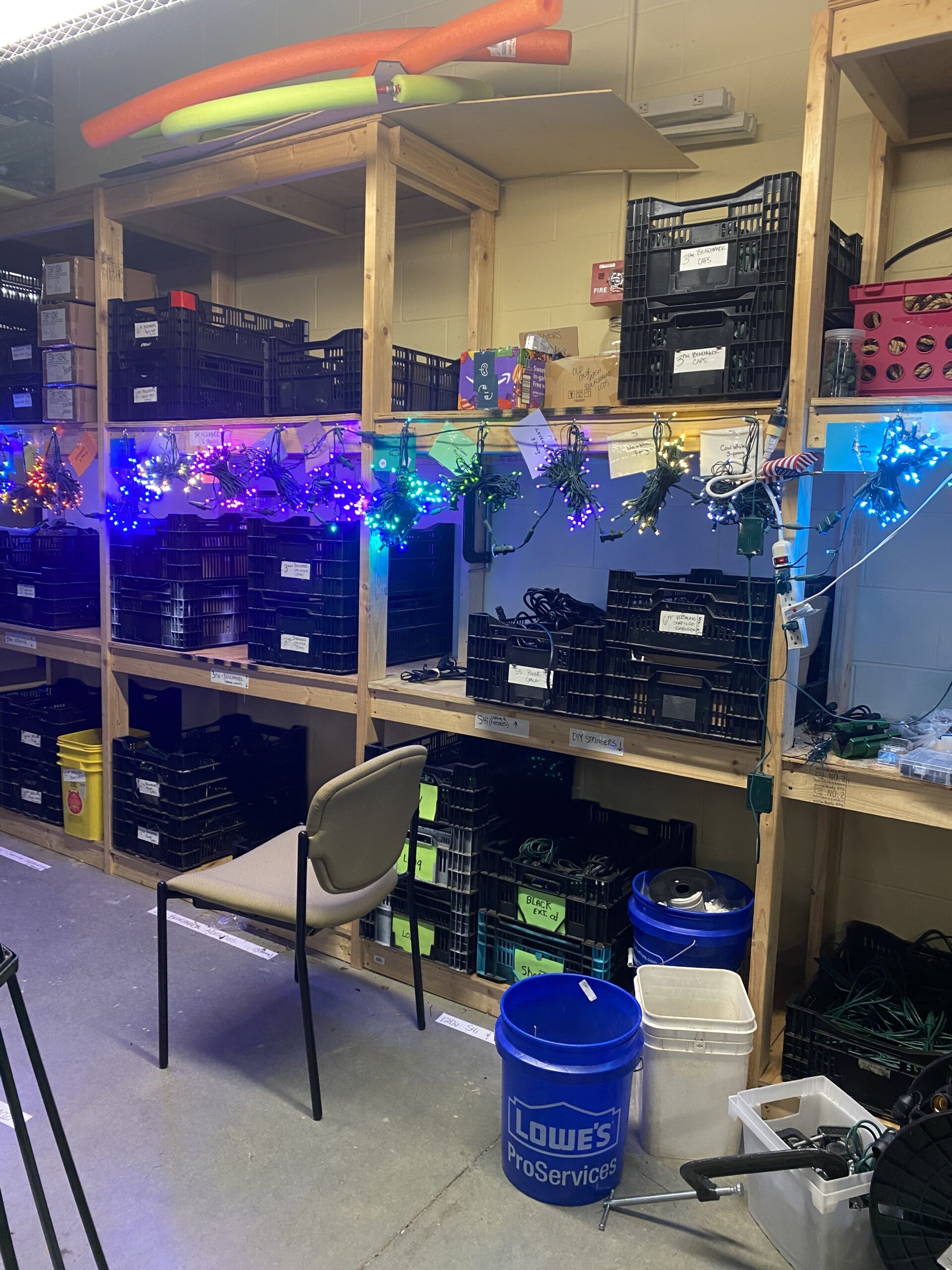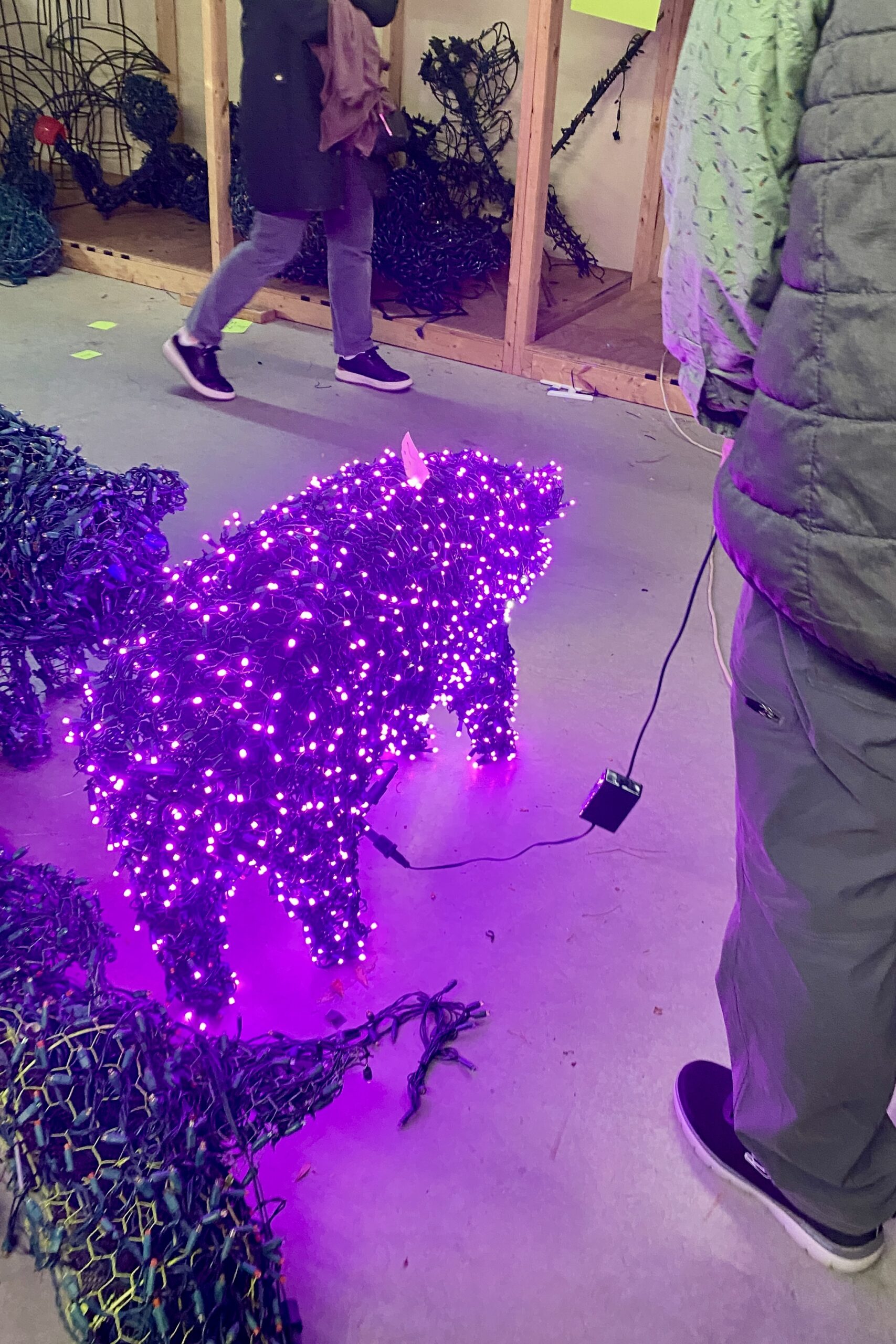 My tour group then went down to the basement of the Kelley Education Center, also known as the room “where the magic happens” to Bob and his basement buddies. In this room they discuss themes, create light forms, and store those from previous years. Countless crates filled with 40 string lights each fill the middle and edges of the room. As we walk further in, we come across a pig-shaped light form that Bob repaired.