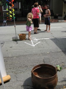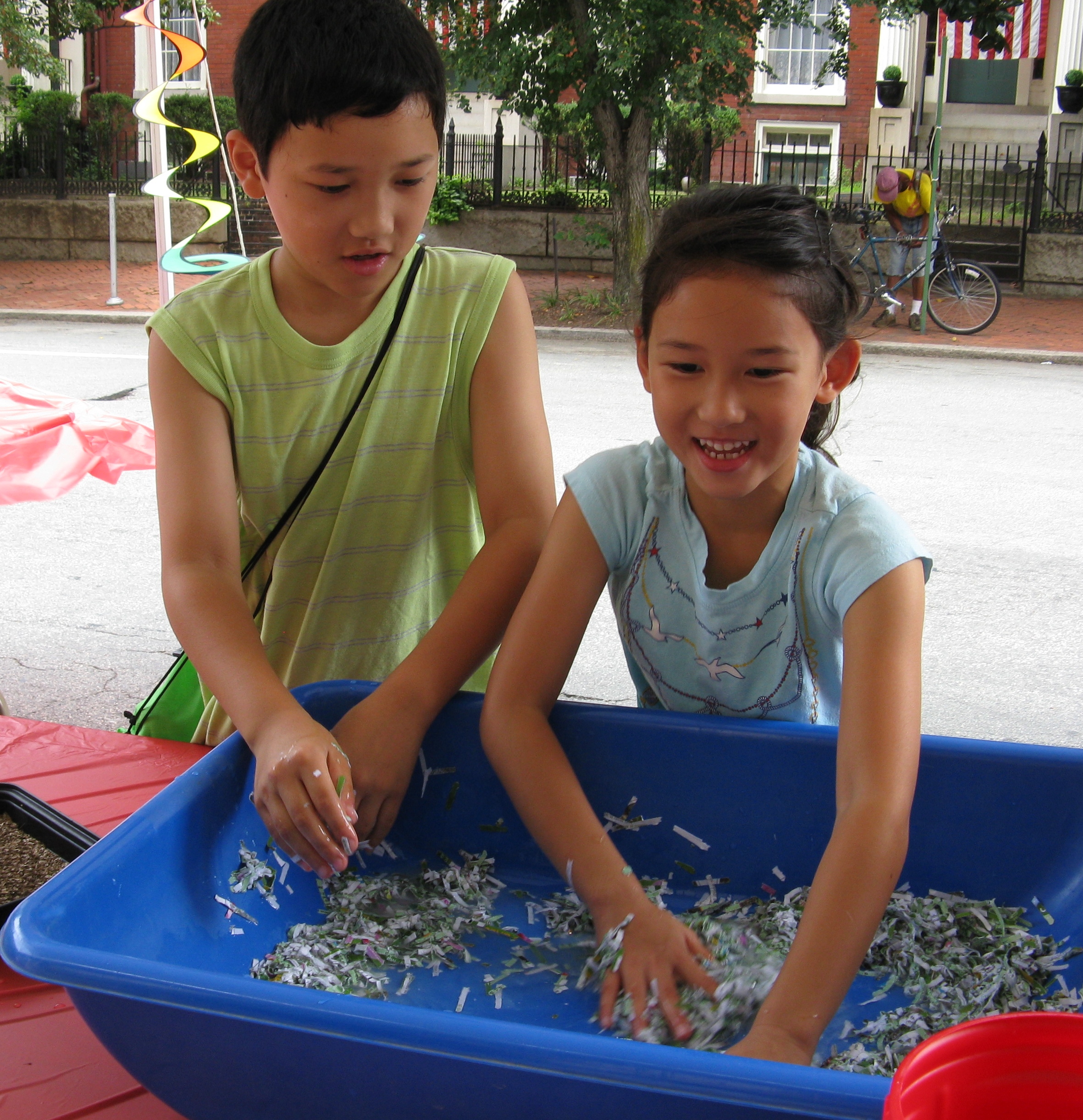 At the Richmond Public Library “Dig into Reading” Summer Reading Finale this weekend, the Children’s Garden tent had a recipe for success. Start with inspiration from nature-based children’s books. Take one part water. Add two parts shredded paper (recycled, of course). Invite about 80 enthusiastic children to squish it all together in to a mushy pulp. Harvest dill seeds. Roll pulp and seeds together. Voilà– a dill seed ball that will grow into a tasty treat for both people AND swallowtail caterpillars!