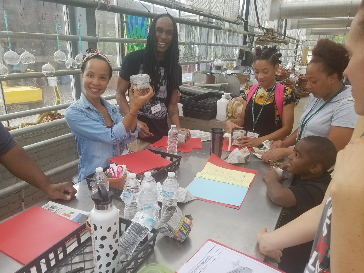 Elisa Bennett Holding up a plant in the greenhouse