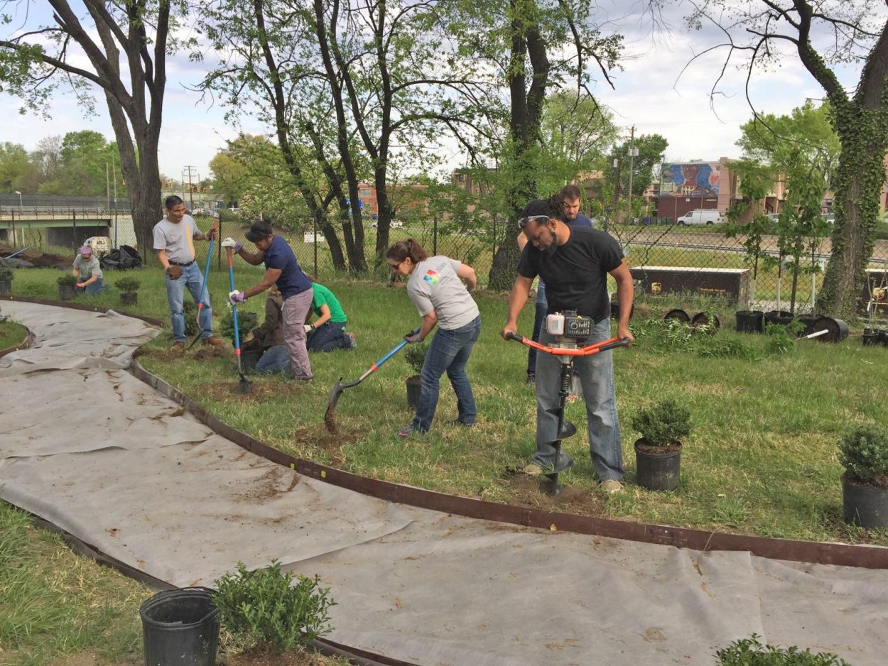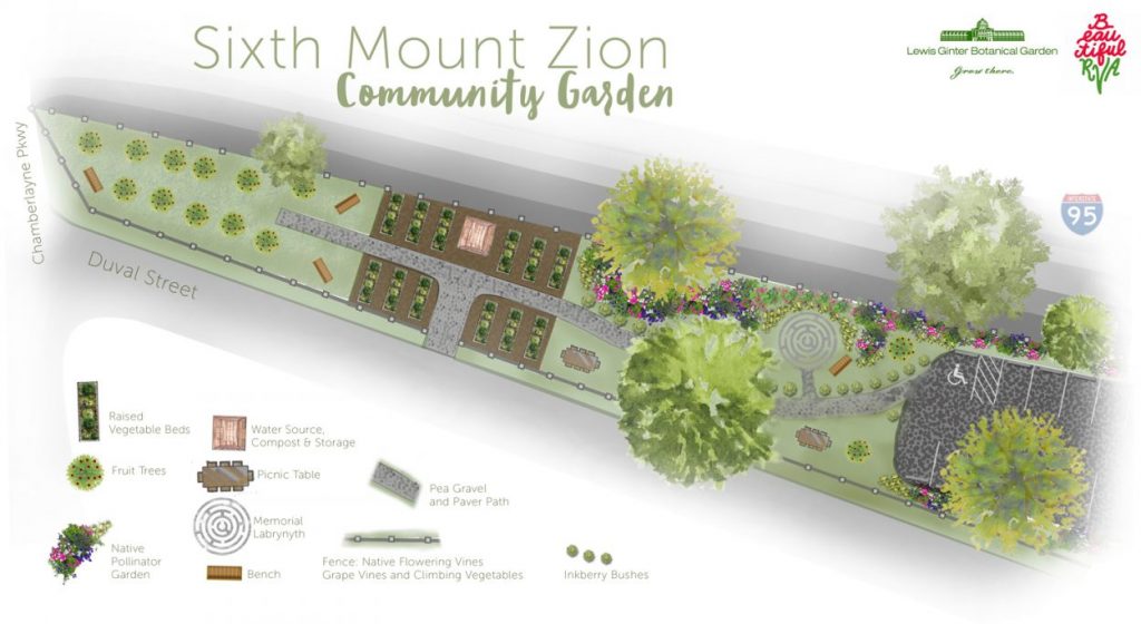 For 12 weeks leading up to this morning the inaugural cohort of the Lewis Ginter Urban Gardeners had met to learn and sustainable urban horticulture, garden design community engagement and make plans for this first project. Earlier this month, ground was finally being broken and volunteer coordination skills deployed as nine fruit trees, 25 inkberry bushes and 20 grape vines were planted, and 12 raised beds and an accessible winding path were constructed. It was a beautiful morning as the combined efforts of Renew Richmond, Altria volunteers, and Lewis Ginter Urban Gardeners brought what had just been a dream and plan on paper into reality. This project, referenced in Michael Paul Williams’ Richmond Times Dispatch column earlier this spring, is in part a commemoration of the neighborhood that was torn apart by the construction of Interstate 95 in the early 60s. Bricks from the foundations of homes were uncovered during the garden’s installation.