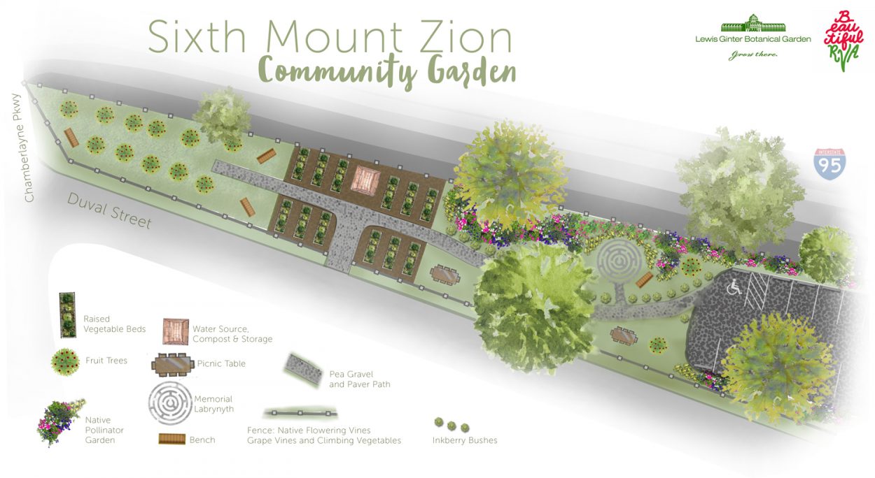 Duron Chavis, Community Engagement Coordinator for Lewis Ginter Botanical Garden, has no trouble communicating his life-long passion for urban gardening, but even he has to shout over the roar of Interstate 95 as he shares with about 25 volunteers from Altria the history of how that very highway was constructed where thousands of homes had been. The community’s fight to preserve the historic Sixth Mount Zion Baptist Church had also saved a small triangle of land where the Community Garden would soon, after just a bit more “sweat equity,” be located. It is a history that for too long has not been told at all, let alone shouted, but a small group of citizens is working to change that narrative.