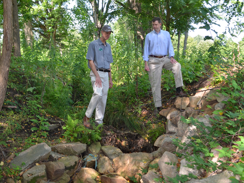 (Left to right) The Garden’s Horticulture Director John Morse and Dominion Energy’s Manager for Regional, State and Local Affairs (Virginia) James Beazley, examine the gully site.