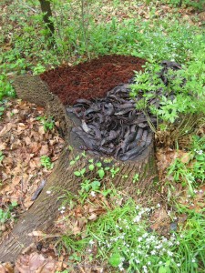 Sweet gum (Liquidambar styraciflua) and Honey Locust (Gleditsia triacanthos) pods on the stump of an Ash tree at Ambler Arboretum at Temple University. Photo by Grace Chapman.
