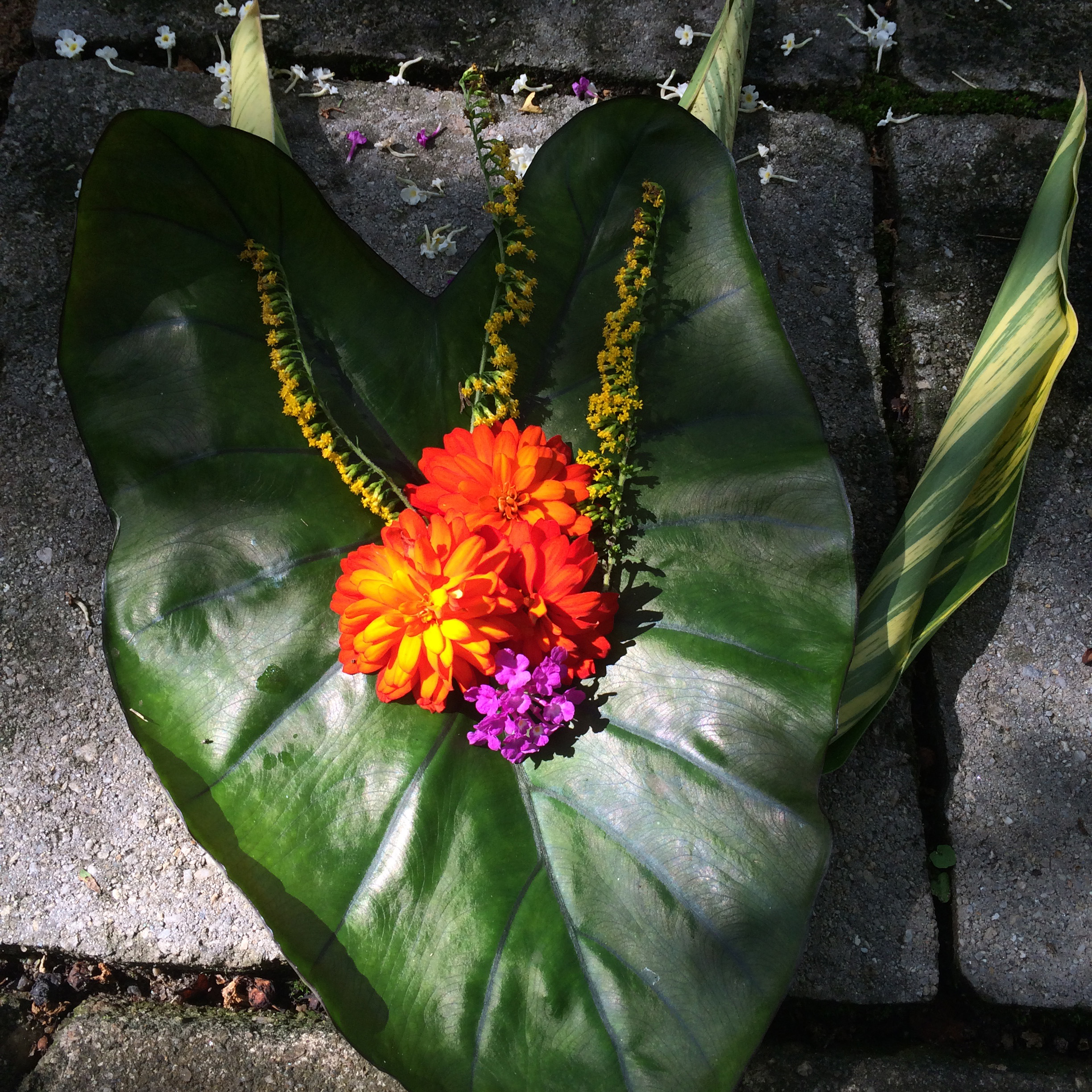 “The one I made last week was inspired by the fact that I was getting ready to pull the annuals out for the fall. I had been looking at the elephant ears and thinking that they would make a nice backdrop/container for making a little arrangement. I love the idea of visitors discovering them and imaging that a garden fairy (or some other form of magic) made them. It’s a fun way to try different plant and color combinations and a quick way to add a little more creativity into my day.”