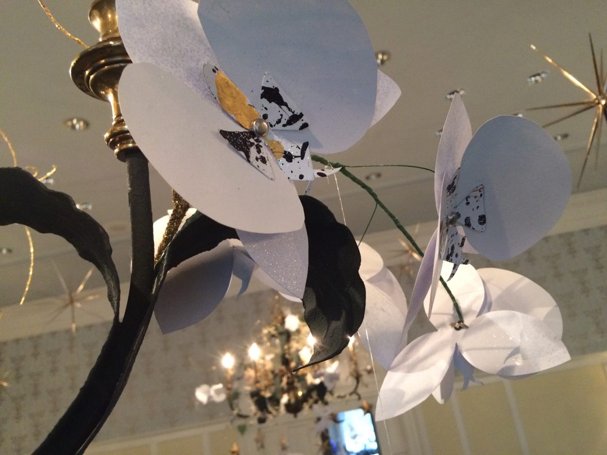 The Robins Room’s 128 paper orchids were handmade by Blackburn and Garden volunteers. A trio of sepal petals cut from opalescent paper and Blackburn’s template forms the base of each bloom. Side petals are cut out of heavy ivory paper. In the center, the flower’s anther cap and stigma were fashioned from of the same ivory paper, spattered with metallic gold and purple acrylic. Based on orchids in the Garden’s collection, the elegant blooms mimic moonlight in the evening.