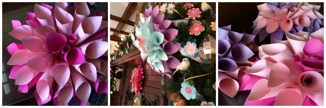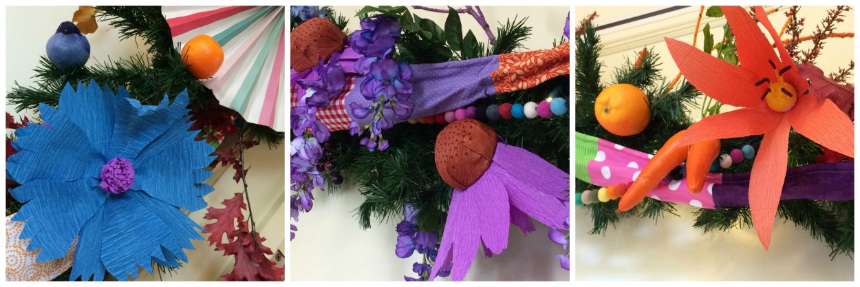 Giant paper dahlias and chains of paper petunias, made by Senior Horticulturist Elizabeth Fogel, Gardener Pam Wood and a group of volunteers, grace mantles in Bloemendaal House — demonstrating that the same color can appear very different, depending on what color it is paired with. The bright blossoms, inspired by a Pinterest post, were made out of scrapbook paper squares rolled into cones and then glued in concentric circles to a cardboard base.