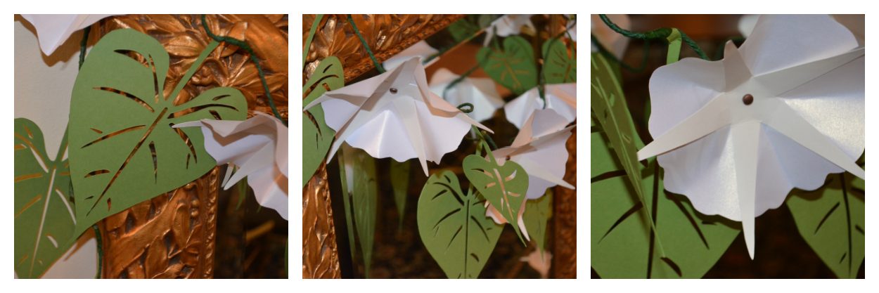 Hand-cut moon flower blooms and green paper leaves in the Robins Room trail along pipe cleaner vines wrapped in green florist tape. Garden volunteers hand-cut 174 opalescent blooms, anchoring an ivory star bract in each creamy center with a single brass brad. Blackburn traced the pattern for the green paper leaves from a dried, pressed specimen.