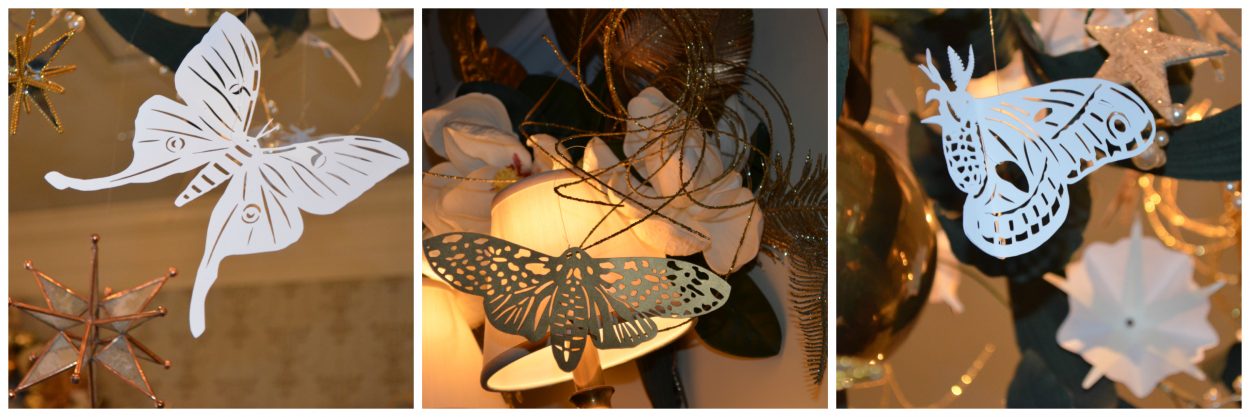 In a perfect counterpoint to the daylight of the atrium, the Robins Room next door is a recreation of night. There, where private events are held, Gardener Colten Blackburn chose moonlight imagery for GardenFest decorations: three species of night-pollinating moths are drawn to garlands of moon flower vines and the glow of white orchids. Blackburn hand-cut templates for the moths from photos he stylized himself. Beth Sawyer Kobus, daughter of Garden volunteer Barb Sawyer, used her Cricut silhouette printer to mass produce the intricate detail of almost 250 moths in heavy white and metallic bronze paper. The moths flit among the night-blooming blossoms, some posed in profile and others with wings wide spread.