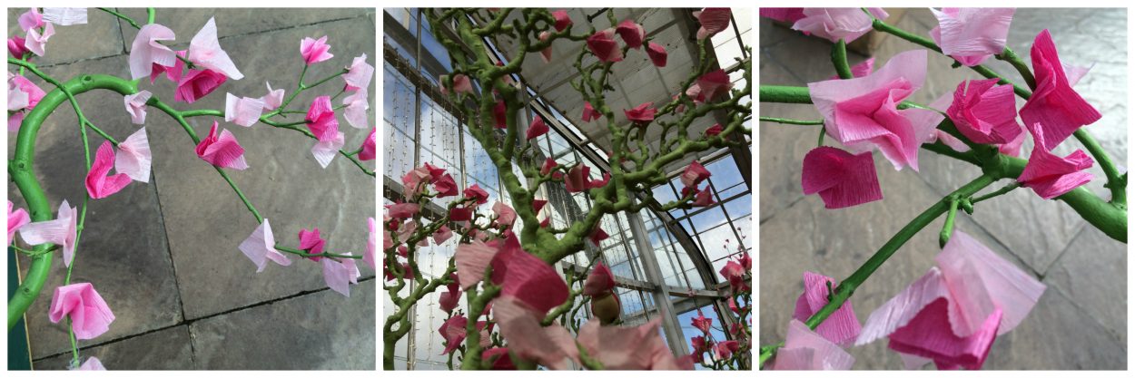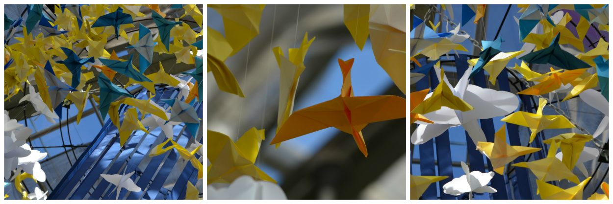 Swooping through a symbolic blue ribbon sky hung with white paper clouds, a flock of hand-folded finches and bluebirds circle above a “pollinator garden” below. They’re part of an origami mobile that hangs in the West Wing of the Conservatory, made by Horticulturists Leah Purdy, Chelsea Mahaffey and a cadre of volunteers. The origami pattern is called “flapping bird” — each of the 500 birds flap their wings when you tug on their tail and head!