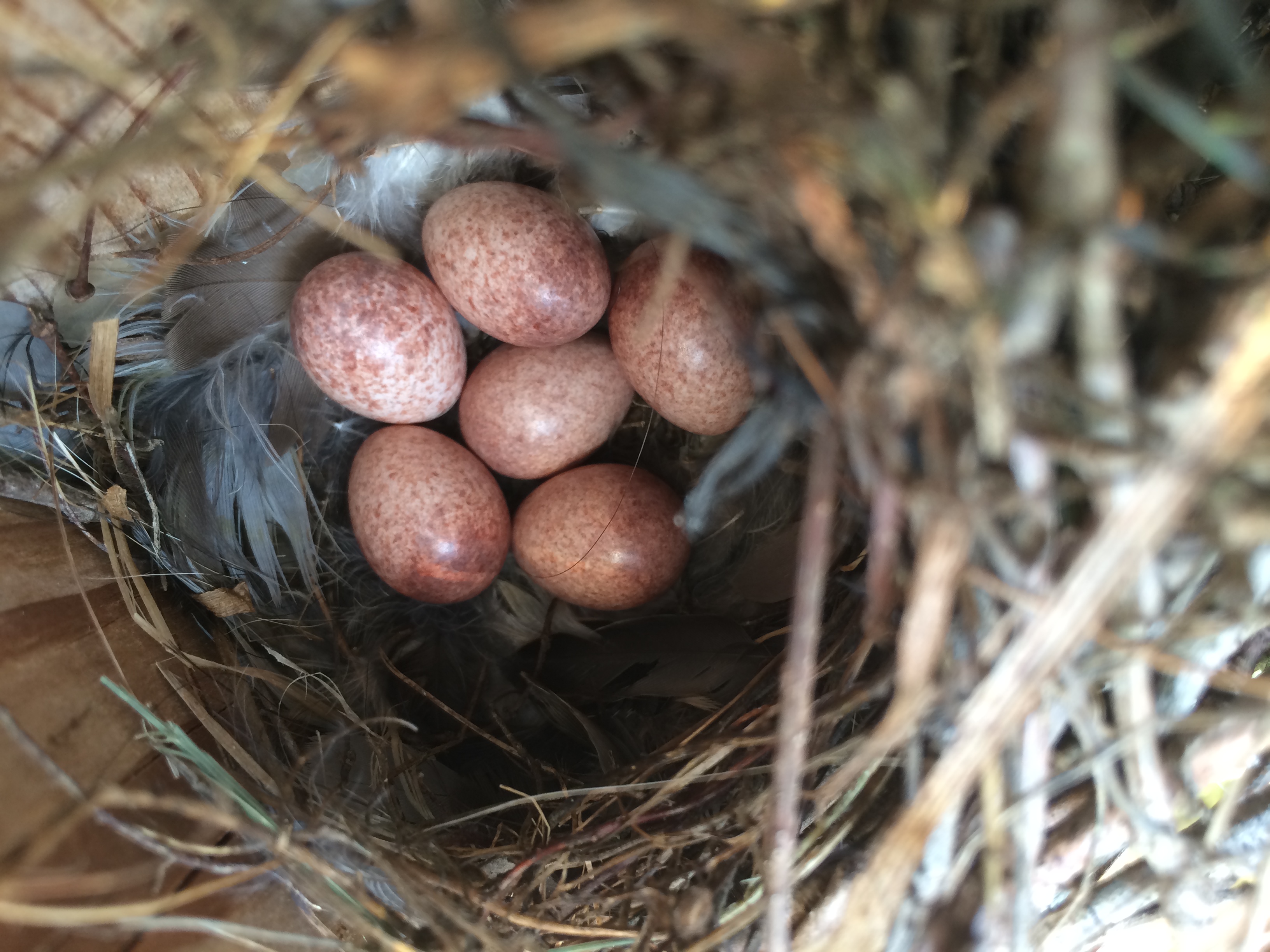 We are well into the 2014 nesting season and have seen a lot of activity so far. The season began a little late this year with many Carolina chickadee nests and way too many house sparrow nests. Happily, we saw our first bluebird nest in mid-May. The nest resulted in four fledglings by mid-June. I have included a picture of bluebird eggs from one of our nest boxes for you, in case you have not seen them before. Note that they are blue, like robin’s eggs, as opposed to brown, like the wrens eggs also shown.