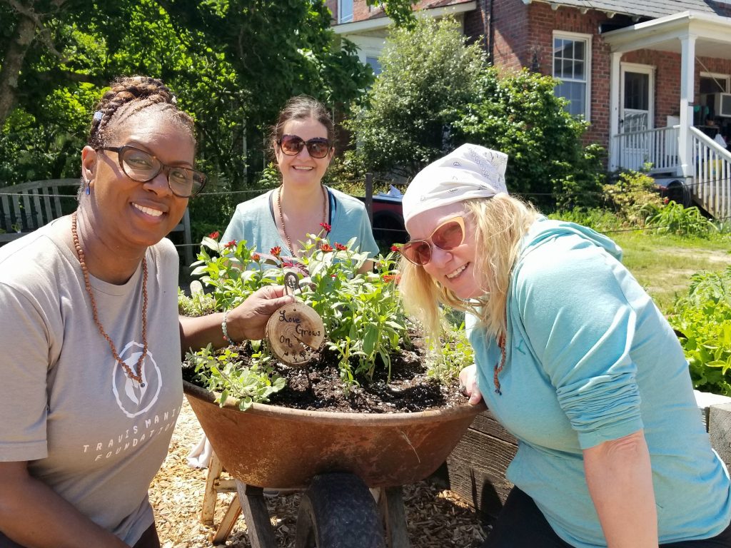 Erica Johnson (left), Susan Orellana-Clark (center) and Kimberly Hughes (right) planted a container garden at Lewis Ginter during a retreat for healing led by Taryn Davis, founder of the American Widow Project.