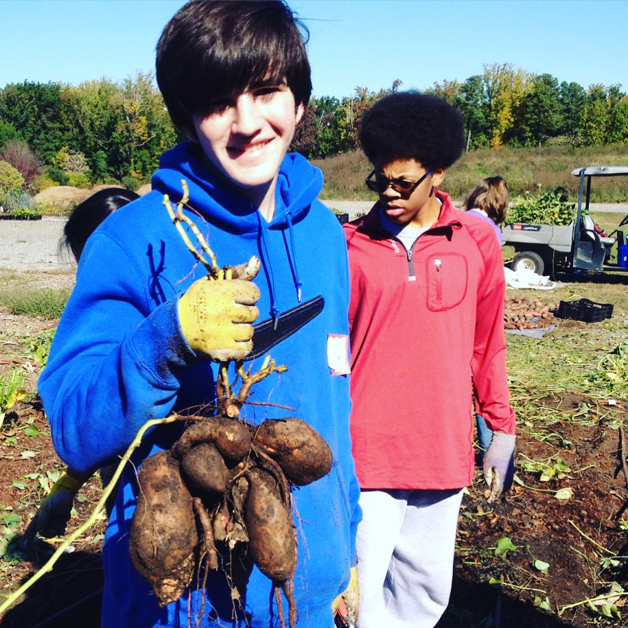 After the team-building we divided into groups, half worked harvesting sweet potatoes and picking off cabbage worms in the Community Kitchen Garden benefiting FeedMore. The other half came with me to the Children’s Garden. My group helped replant Alliums and Narcissus that we were moving to a new location. I showed them how to space the bulbs and how deep to plant them. They got to use some creativity and lay out where to plant the bulbs. As part of the HandOn Day program, the Children’s Garden received a stipend, we used this money to purchase plants that we will use to teach students and teachers that visit us for field trips and workshops at the Garden. The group help plant all of these as well. It was so great to have all that help! While we were planting I listened. It was wonderful to hear the laughter and stories of 15 students becoming friends, sharing about other volunteer experiences, and how it makes them feel to volunteer. By the end of the morning it was as if they were one team working together for a common goal.