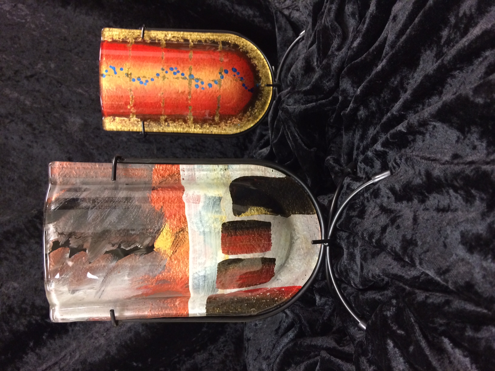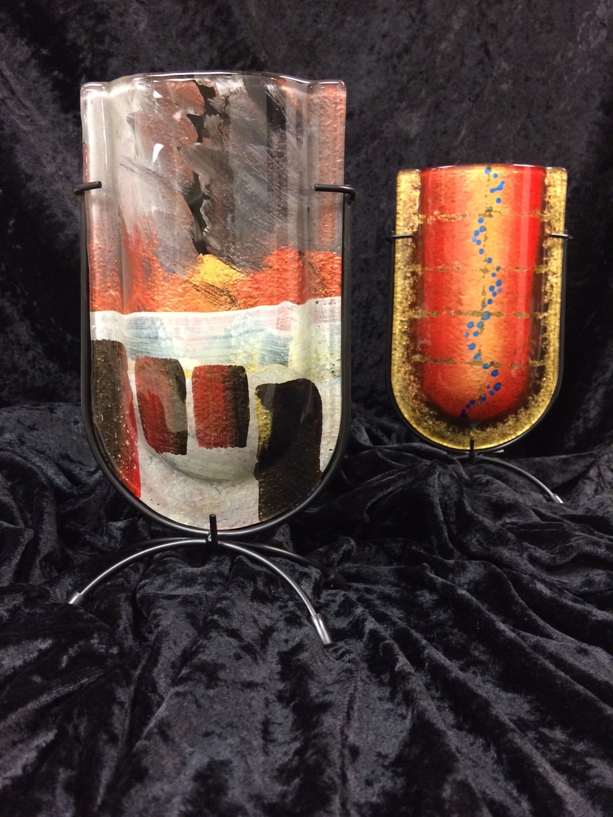 Fused glass vases created by San Francisco artist Benjamin Chang are functional fine art. Overlapping pieces of colored glass are fired just to the melting point, when they meld into a unified piece that takes shape as it drapes over a mold. Hand-painted accent details are applied afterward. Each piece is unique and comes with its own black metal display stand. $30.