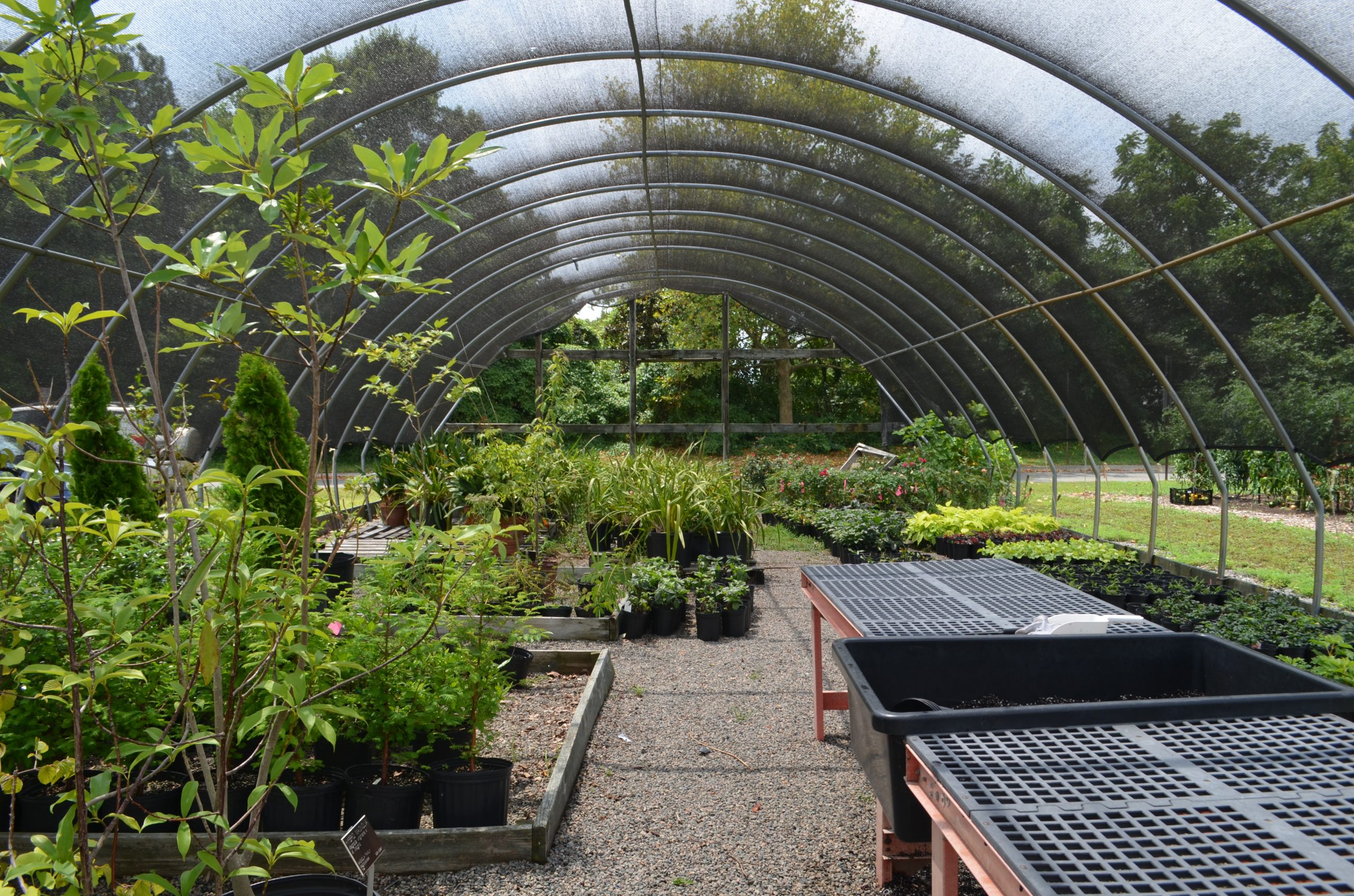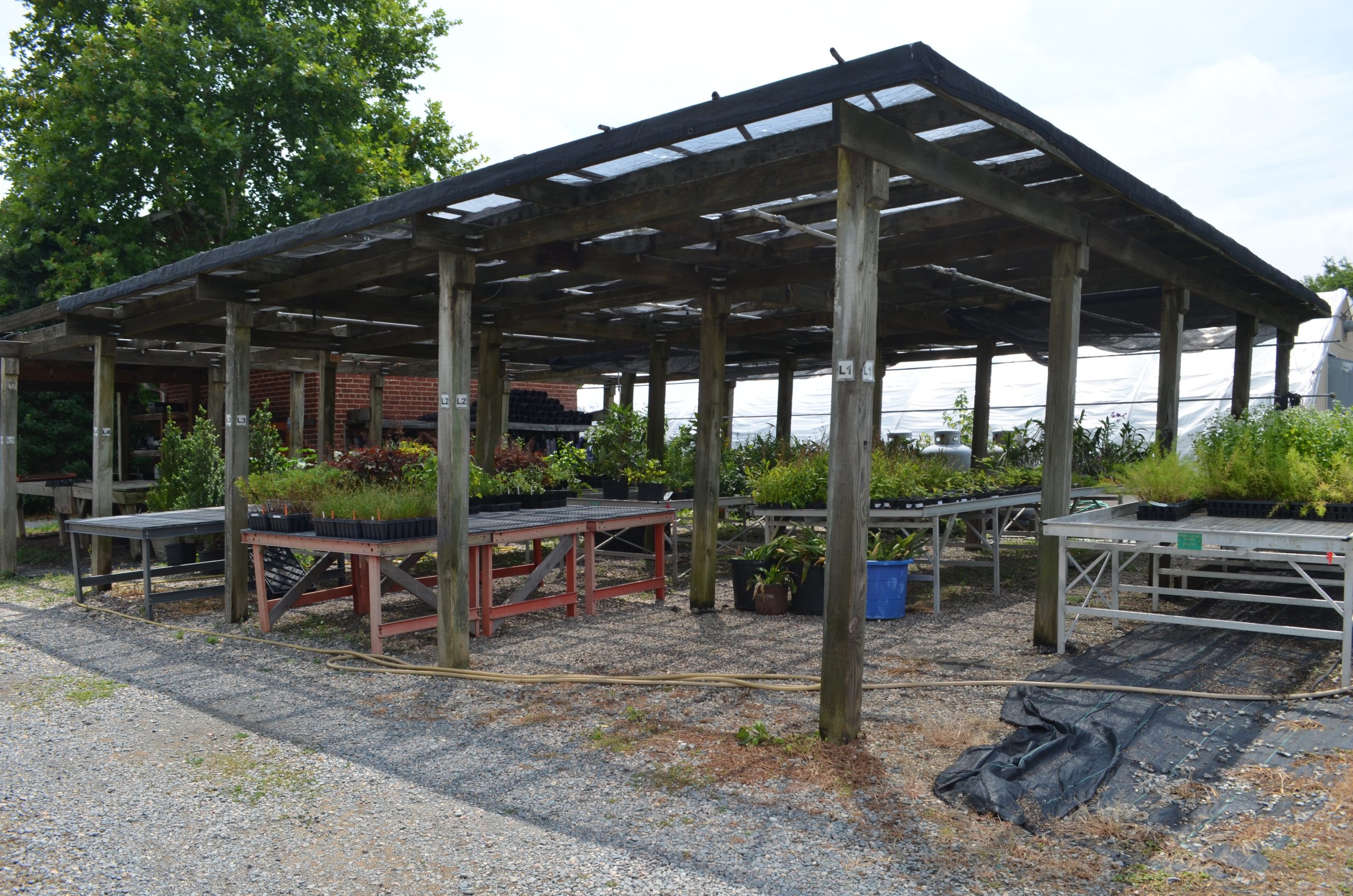 We walked to the Lathe House, an open wooden structure with several tables of potted plants underneath, located behind the Massey Greenhouse. These plants, Woll explained, are being held for future plantings somewhere in the Garden. Until then, it’s Woll’s job to care for them and keep them healthy.