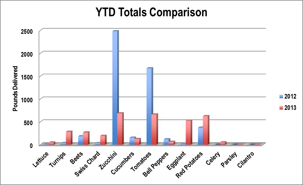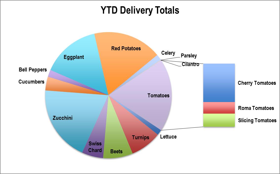 Our yield stars this season seem to be the cherry tomatoes and eggplant. We have delivered over 400 pounds of cherry tomatoes in the past 6 weeks (listed under tomatoes in the graph below). Our eggplant are just getting started, and we have already taken 528 pounds over 5 weeks.