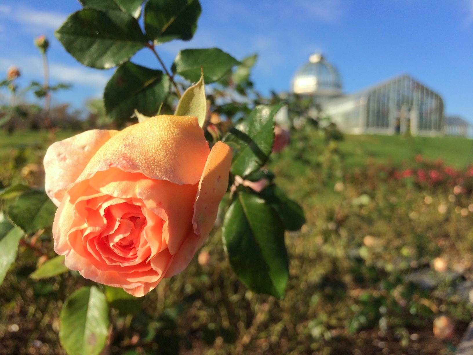 Roses bloom from early May until early November in the Louise Cochrane Rose Garden – they are the longest-blooming plants in the Garden’s collection. Mrs. Cochrane’s favorite, a British cultivar called Rosa ‘Auscot’ Abraham Darby®, bred by David Austin®, is an English shrub rose with a rich, sharp, fruity fragrance. It bears large, cup-shaped flowers in shades of apricot and yellow that fade to coral-pink as they age.