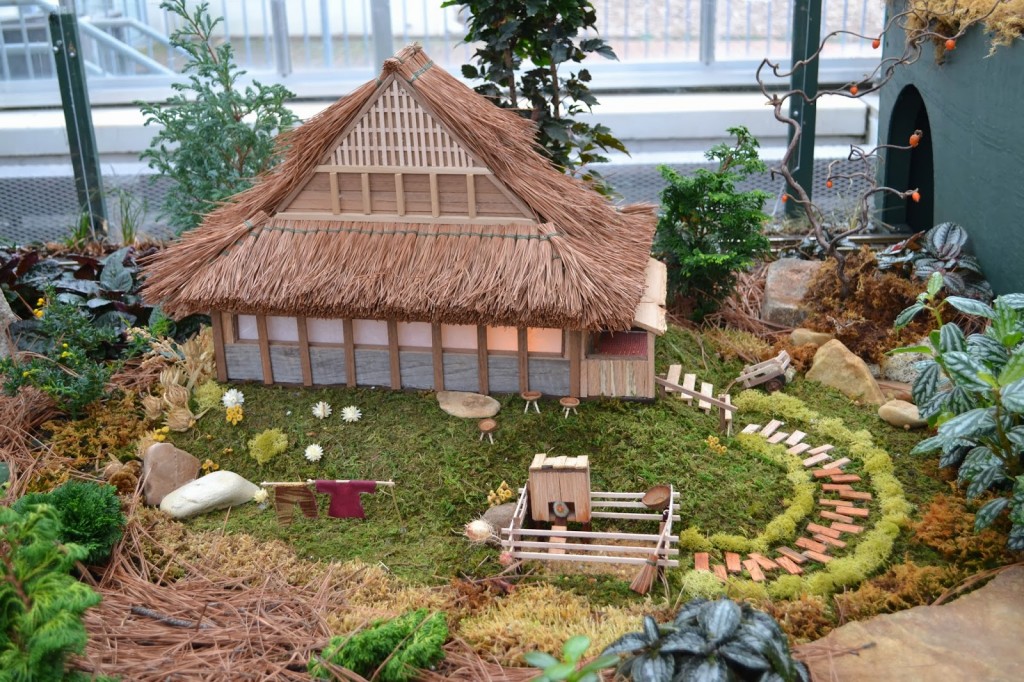 Asian-style house from the 2012 display. Pine needle thatched roof and colorful pressed leaves look like clothing drying on the clothes line.