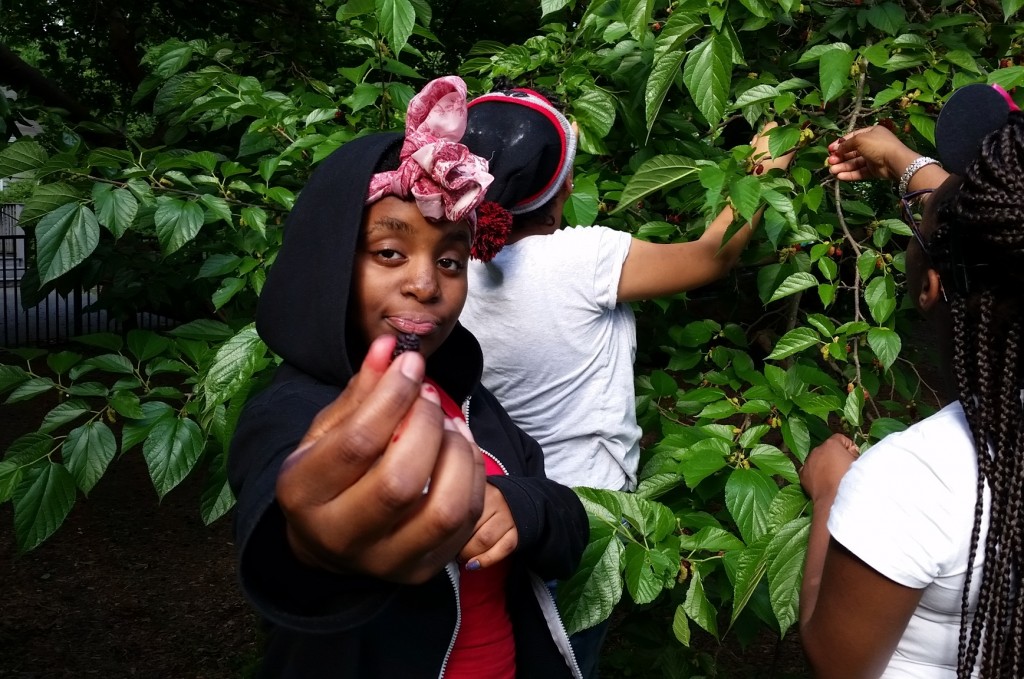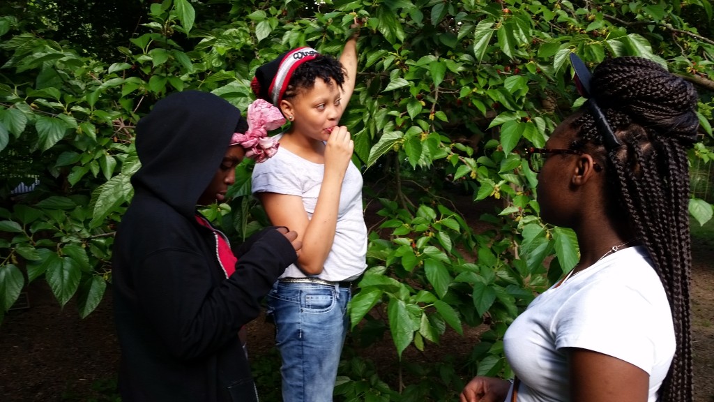 The group harvests mulberries and strawberries for the pancakes. This is not their first time trying these fruits, though for many, their last visit to the Garden was where they first tried them. I sit under the mulberry tree and ask the students “What would you say to someone in the next NextUp session who didn’t want to try these mulberries?”