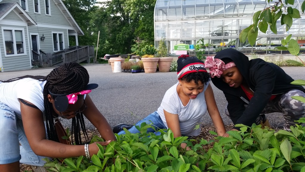 Students from Henderson Middles School’s NextUp program collect strawberries in the Children’s Garden