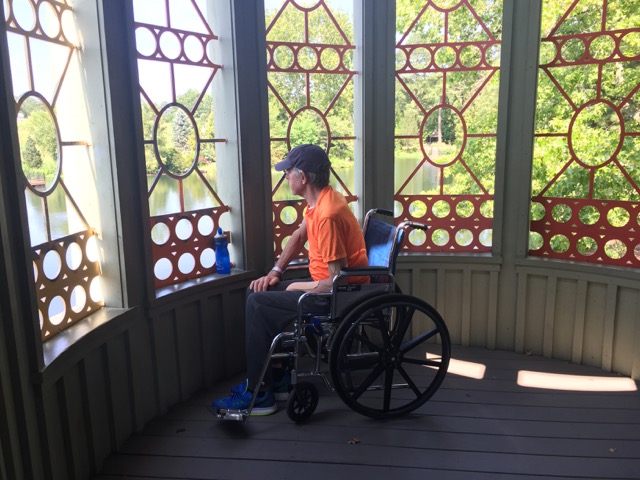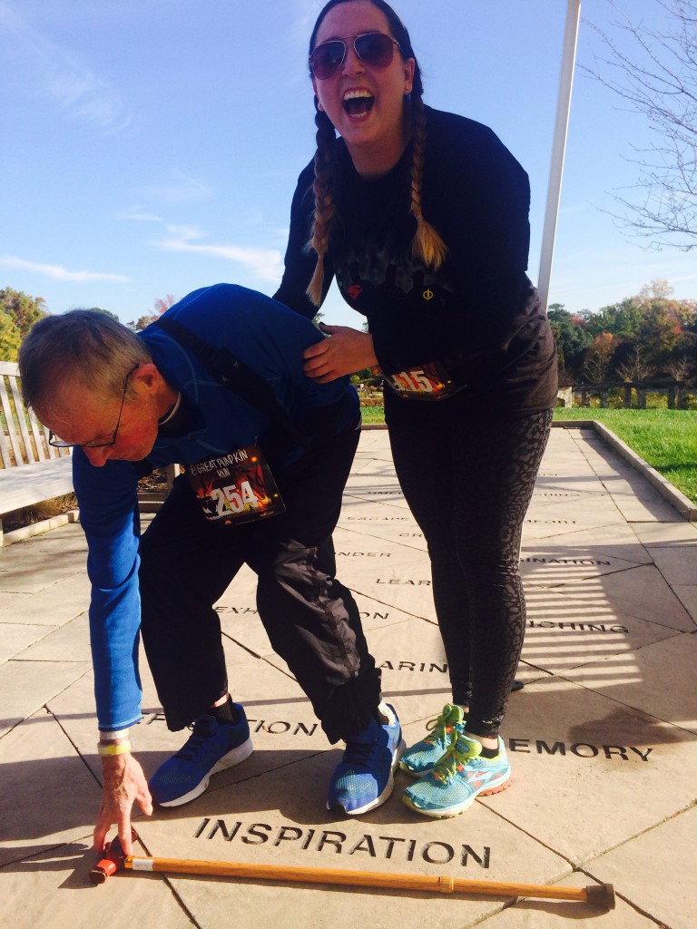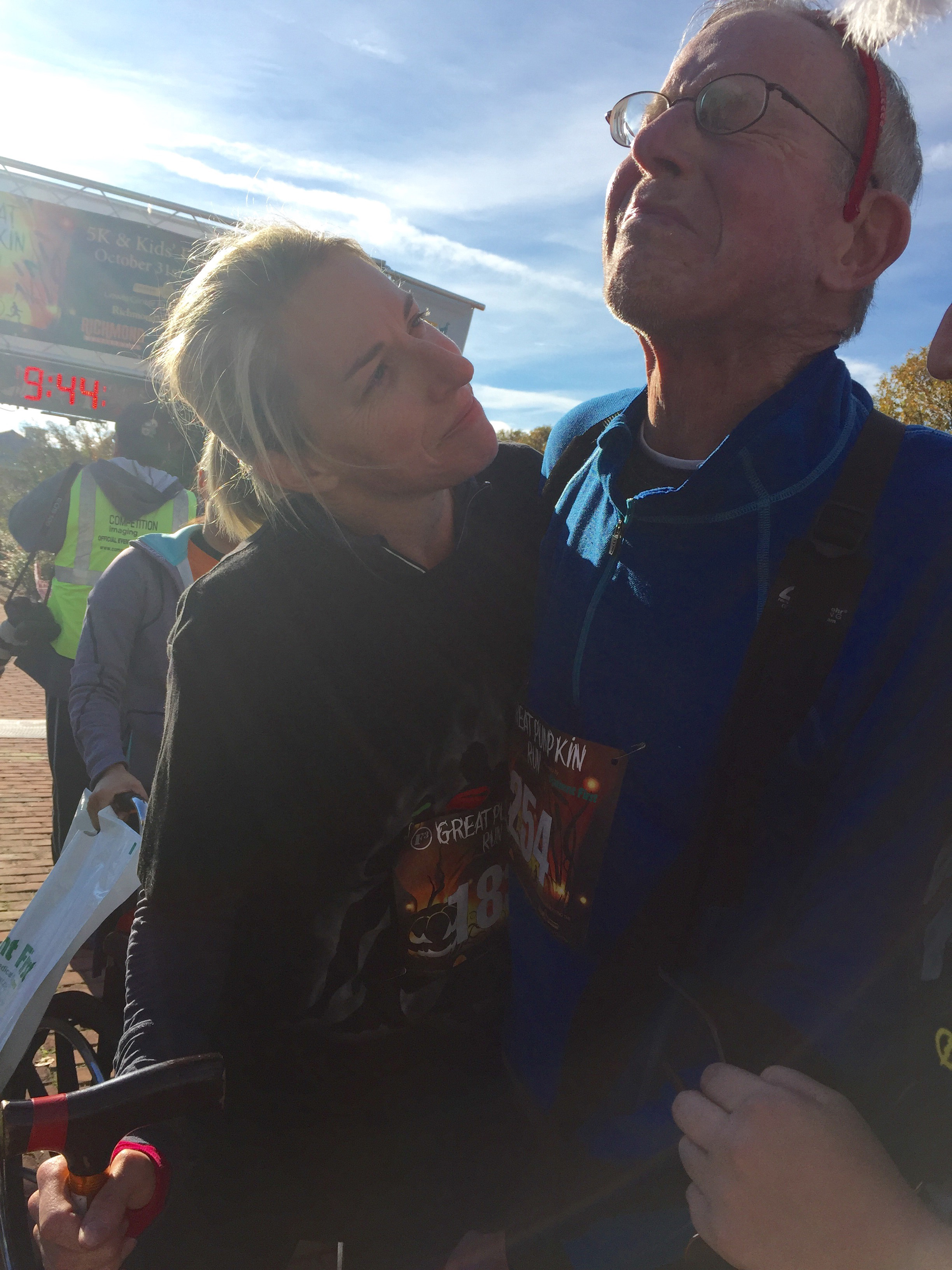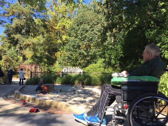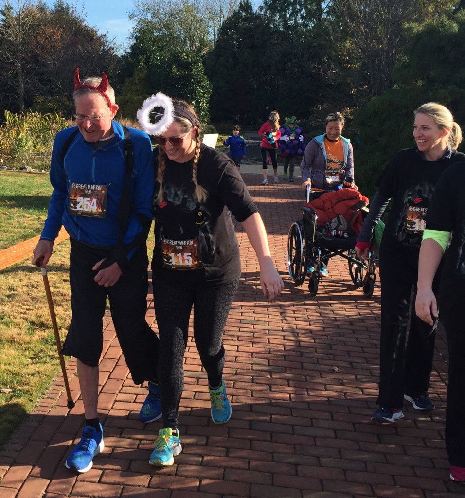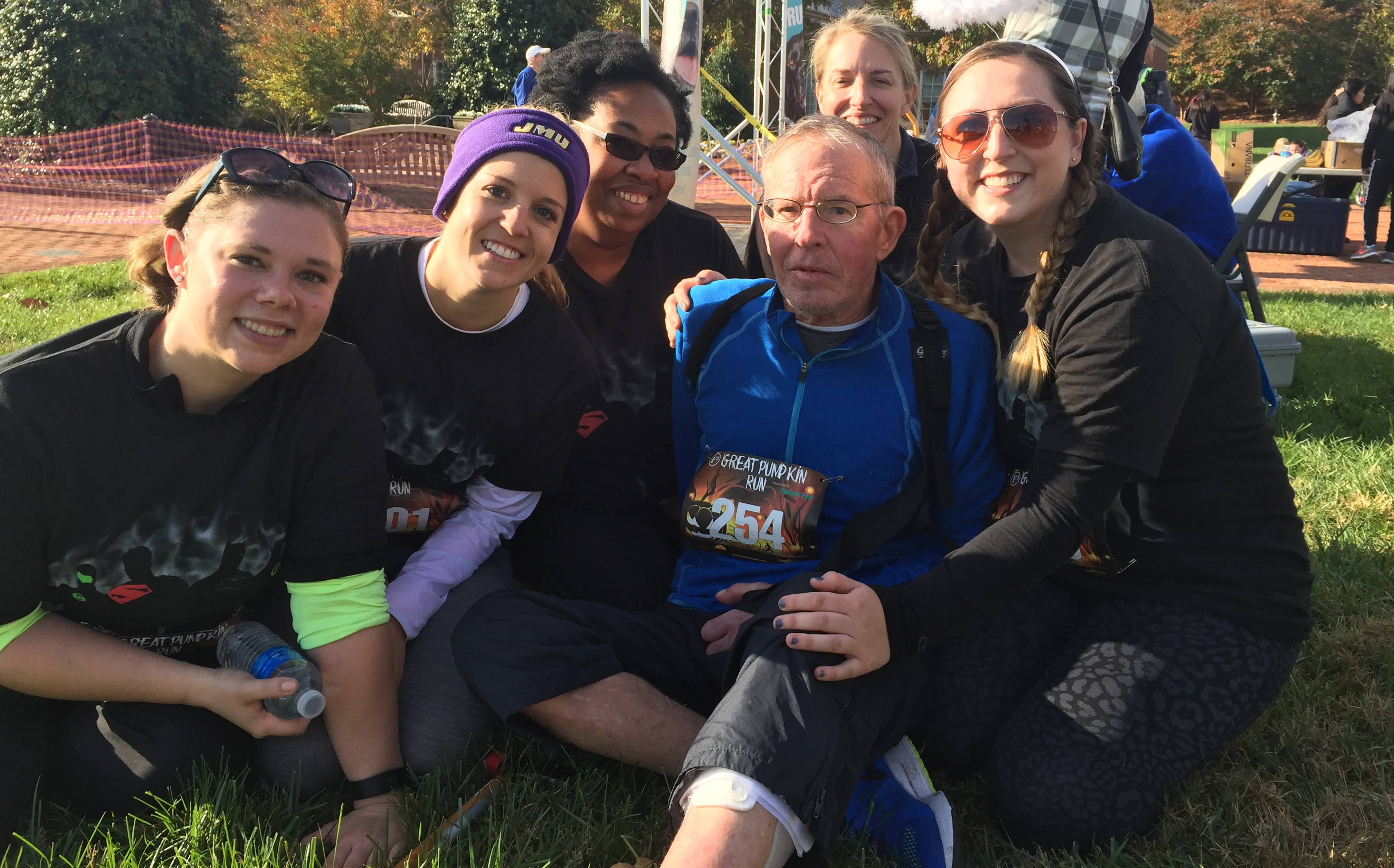 I got an email from a Garden visitor, Ashley Gordon, who was looking for race photos of her group. She explained she and her coworkers had just helped one of their patients complete Lewis Ginter Botanical Garden’s Great Pumpkin Run 5K, and she wanted to make a photo book for him as a gift. Don Walters moved to Richmond 8 months ago after a stroke so he could be closer to his daughter while he recovered. He lives in a West End residential treatment facility, WestPort. The stroke left this former runner in a very different place physically — Walters had to learn to walk again. And with plenty of hard work and support from his team of therapists, he completed the race, by wheelchair and by walking the last 300 feet. When I heard about Walters, I knew immediately I wanted to meet him. So on a Sunday afternoon, Walters, his daughter Amy Walters, and Walter’s entire rehabilitation team showed up to chat with me at the Garden. Wow, I had never seen so much love. I really didn’t expect his whole crew of therapists to show up on on their day off. Walters made quite an impression too.