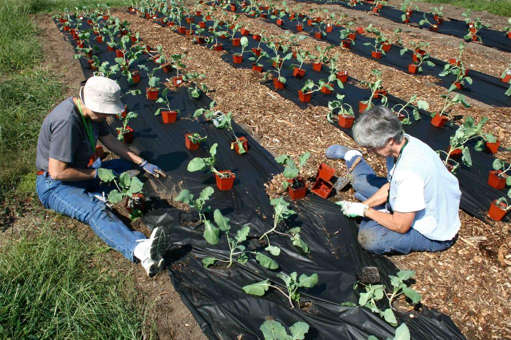 It’s time to plant the “cole” crops: Brassica (Cruciferae) family members like broccoli, cauliflower, and cabbage. Five intrepid volunteers joined us for Fall planting day at the Lewis Ginter Community Kitchen Garden. “Intrepid” because they had no idea of the task before us: Get on our knees and plant 150 cauliflower plants and 225 broccoli plants within the three hour work session. The beds had been tilled. The team laid the soaker hoses and the planting process began.