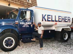 George Noel, fondly known as "Little George" with the oil truck he uses to deliver oil to Kelleher customers