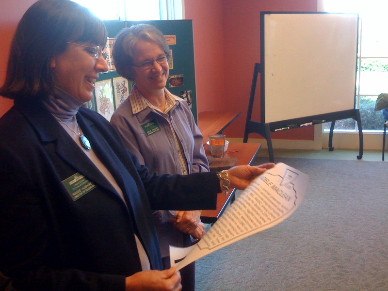 Randee Humphrey, Director of Education, presenting departing employee, Adele MacLean, with her own historic landmark.