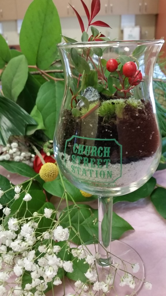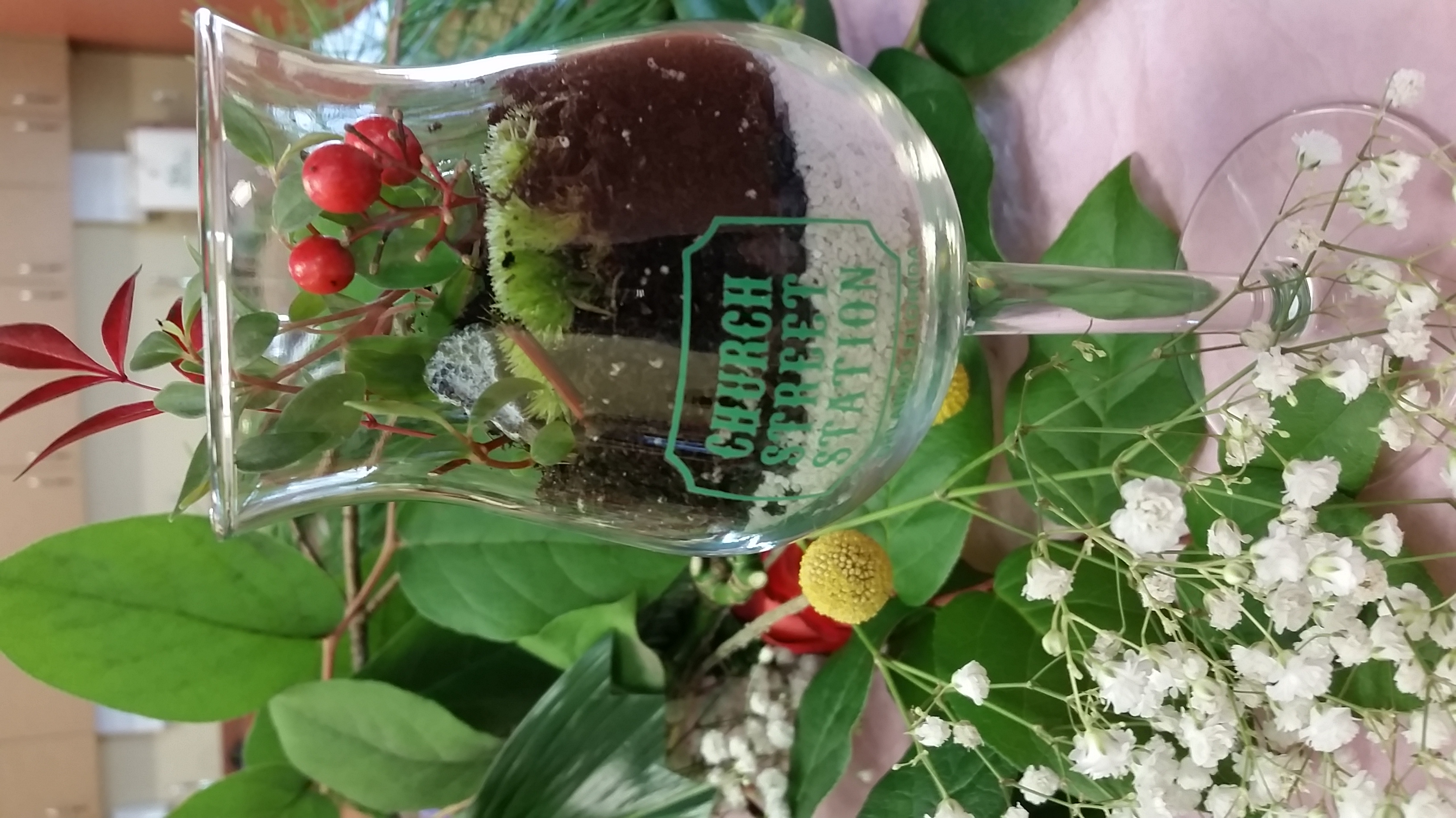 A specialty glass embellished with the logo of a favorite restaurant or entertainment venue can be filled with soil and tiny plants as a living gift doubling lasting memento of good times shared.