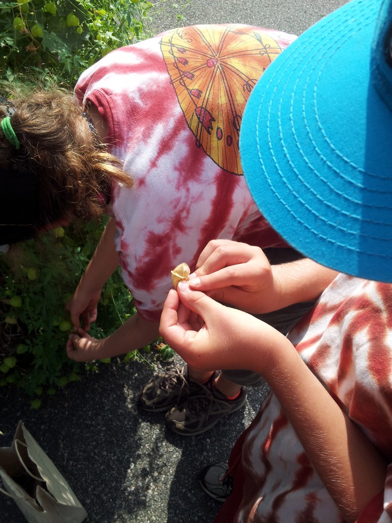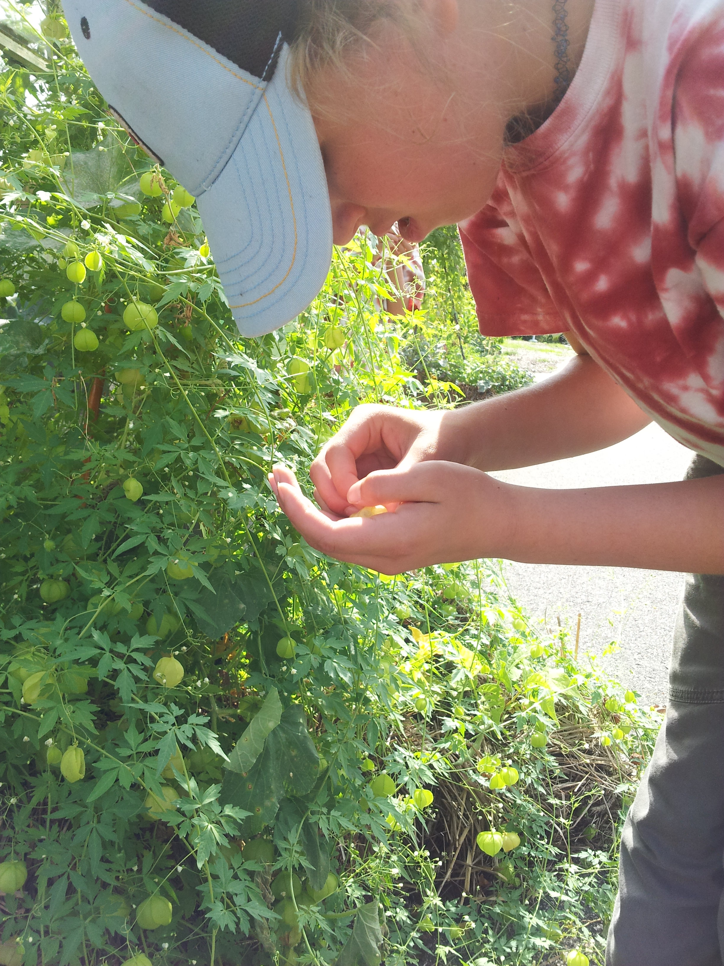 Youth Volunteers in the Children’s Garden collect Cardiospermum halicacabum (also known as love in a puff, balloon vine, or heartseed) and package for the Fall Plant Sale. The plant is an annual vine with small green puff balls that can be popped to collect the seeds.