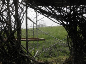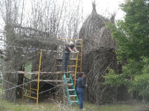 Note: Over the next few weeks, we will bring you updates on the progress of the Patrick Dougherty stick sculpture installation at Lewis Ginter Botanical Garden. We are calling this 3 week transformation of the Anderson Meadow a “Meadowmorphosis.” We will celebrate the completion of the fantasy-like structure with a naming ceremony at Spring Fling on May 22nd. When the work is complete, you will be able to walk through it and peek out openings. The sculpture will be part of the Garden’s landscape as long as Nature allows, so look forward to enjoying it with seasonal changes (and even lighted at GardenFest!) To get an idea of the type of structure he is building, take a look at some photos of Patrick Dougherty’s other work.