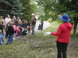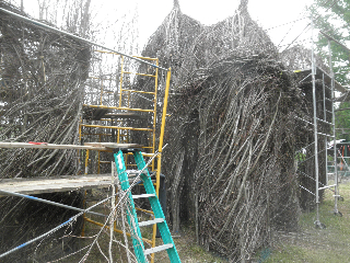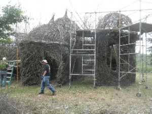 It’s hard to believe the transformation that’s been taking place on the Anderson Meadow is in its final week! What started as a pile of sticks has shaped itself into a work of art. My latest assignment was to assist in building up one of the walls. Once Patrick showed me how to weave sticks and branches into place, I was left alone to finish the task. I studied other parts of the sculpture to see how they were woven so mine would match. While there were minor differences throughout, I looked at it from a distance it and it really didn’t matter. As I shoved sticks and twigs into the mass, I realized that I should just trust my own handiwork and relish the fact that everyone who participates gets to leave his or her own footprint, or rather, handprint into the making of the sculpture. As I write this, I wonder if the artist takes that into consideration as he creates. Perhaps I’ll ask him next time.