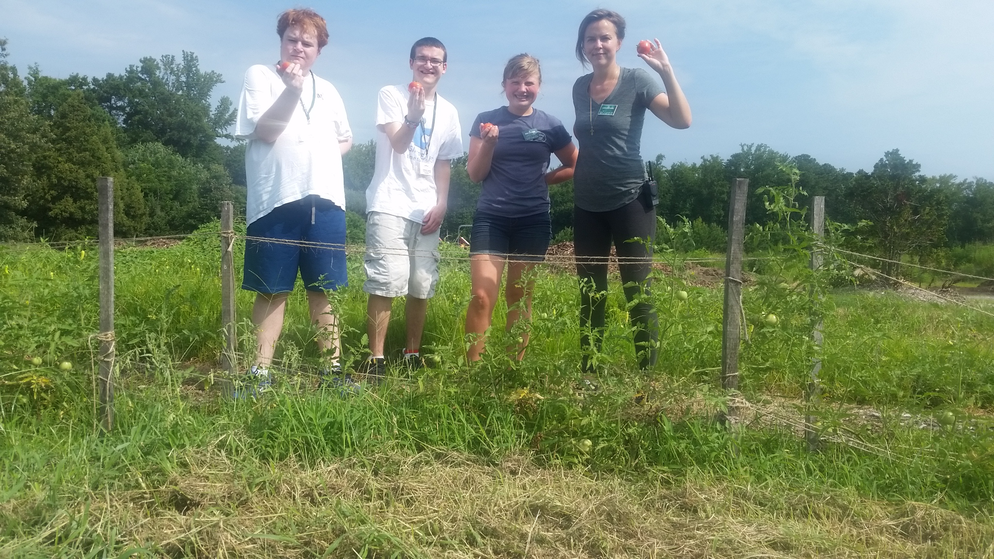 Volunteers from the Founders Center along with Service Learning Intern Kittie Storey and Youth Programs Developer Nicki Apostolow, as they harvest tomatoes.